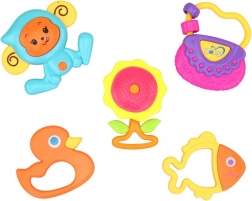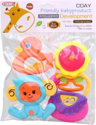 Deze veelzijdige set rammelaars verrast elke baby met diverse vormen en geluiden. Lichte en gemakkelijk vast te houden rammelaars stimuleren de zintuigen, ontwikkelen de oog-handcoördinatie en geven bij elke beweging een kalmerende geluidsreactie.