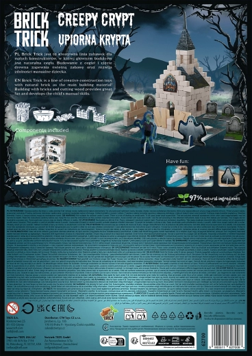 Word een kleine bouwer en bouw stap voor stap je eigen crypte van echte materialen. De set bevat natuurlijke kleibaksteentjes, houten plankjes, een basisplaat en thematische decoraties die je bouwwerk een authentieke uitstraling geven. Dankzij de wateroplosbare lijm kun je het model op elk moment demonteren en opnieuw opbouwen.