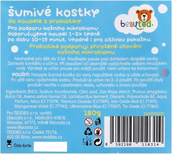 Verander het bad in een kleurrijk avontuur. Bruisende badblokjes met probiotica zorgen voor plezier en zachte verzorging van de kinderhuid. Ze bevatten probiotica ter ondersteuning van de natuurlijke afweer van de huid, zijn verrijkt met mineralen uit zeezout, haverextract en amandelolie. Dermatologisch getest, mild voor kinderen. De praktische hersluitbare zak houdt de versheid vast en maakt doseren eenvoudig.