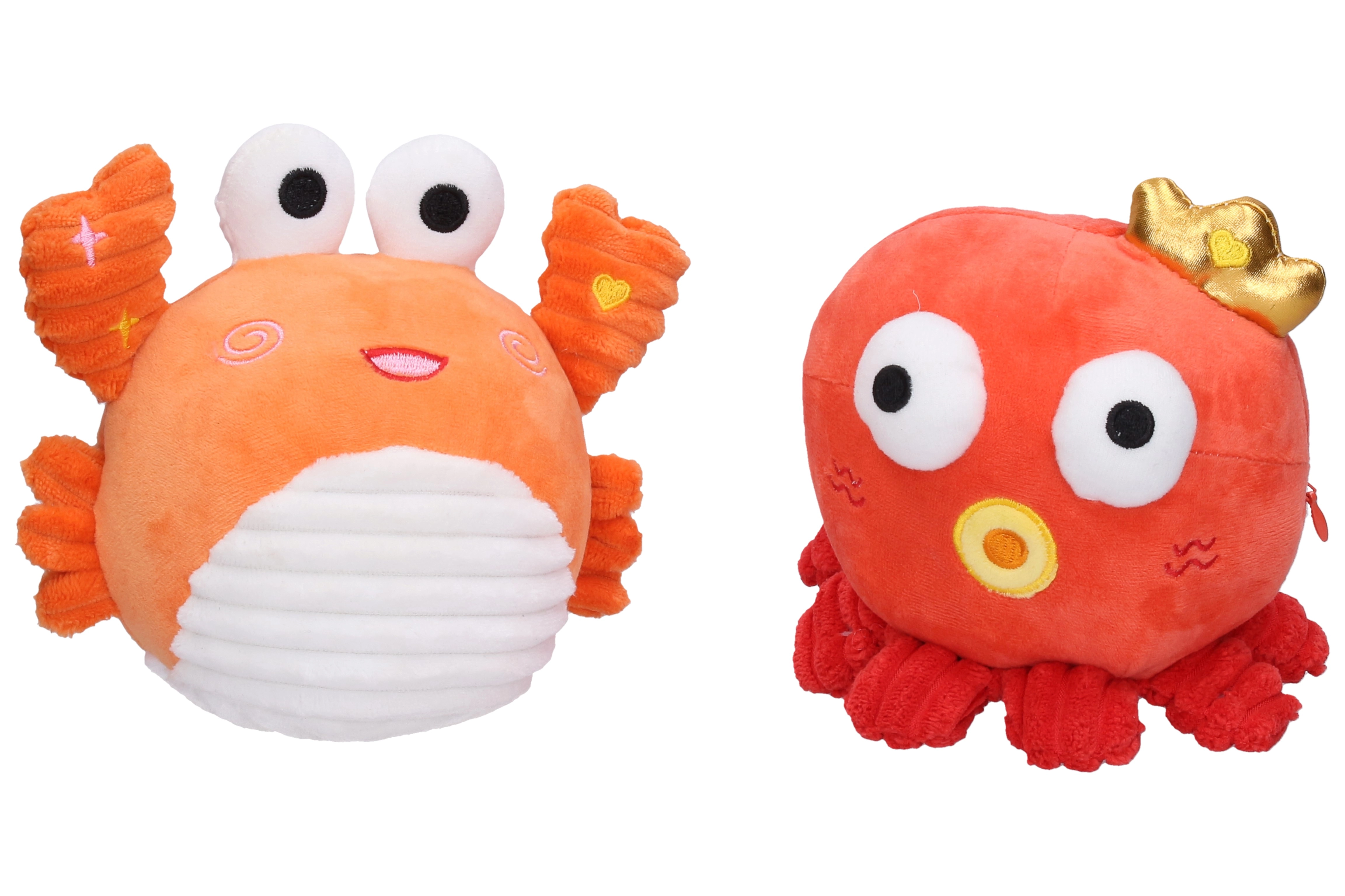 Je kunt kiezen uit 4 schattige varianten – krab, kuiken, blauwe octopus en rode octopus. Elk diertje heeft zijn eigen bedienelement (schaar, vleugel, pet/kroon), zodat kinderen snel begrijpen hoe ze het speelgoed moeten gebruiken. Uitschakelen gebeurt met een praktische aan/uit-schakelaar binnenin het speelgoed en een rits aan de achterkant zorgt voor gemakkelijke toegang tot de batterijen.
