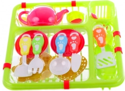 Kindvriendelijke plastic theeset met een praktisch afdruiprek – een hit voor kleine kokkinnen en koks. Bevat een theepot met deksel, kopjes, bordjes, een kom en kleine accessoires zoals lepeltjes. Ideaal voor rollenspel in het huishouden, stimuleert de fantasie en fijne motoriek. Compacte verpakking van ca. 26 × 26 × 6 cm. Leeftijd 3+.