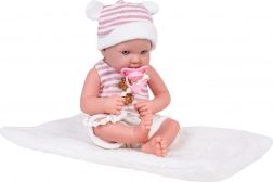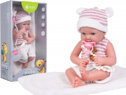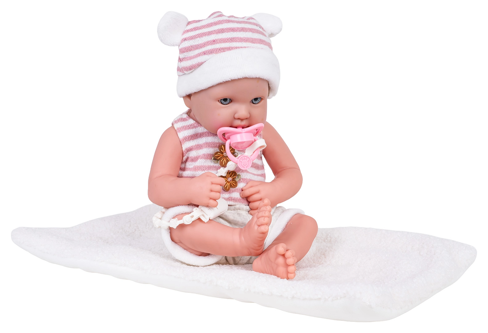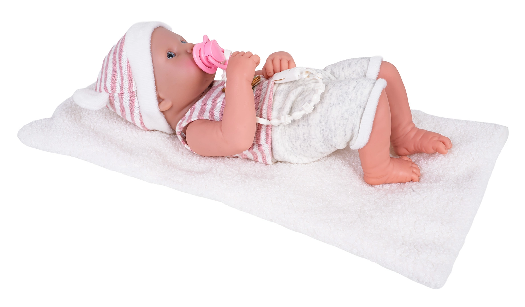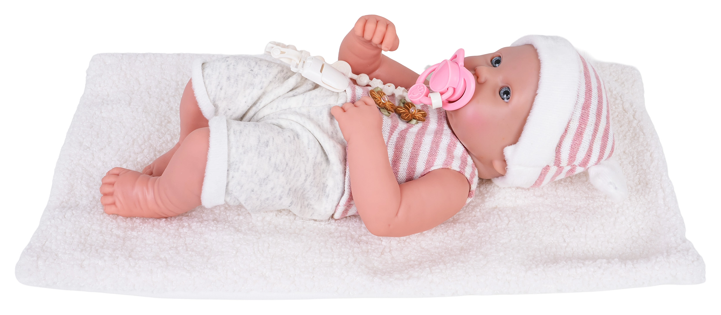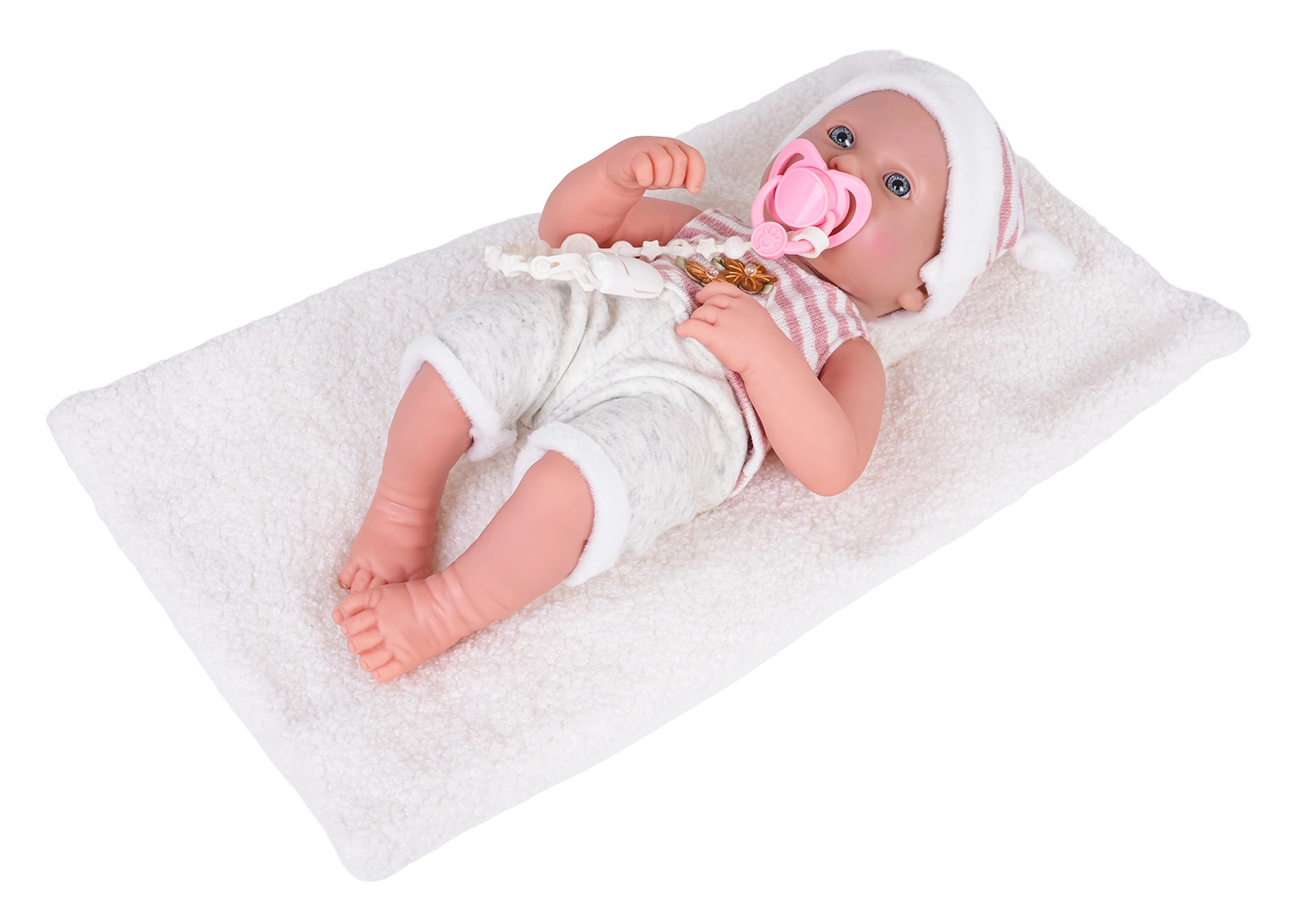 In de verpakking zit alles wat kinderen nodig hebben om te spelen: een fopspeen aan een koord om de baby te kalmeren en een zachte deken om te verschonen of in slaap te sussen. De pop is geschikt vanaf 3 jaar, heeft gemakkelijk uit te trekken kleding (muts, top en korte broek) en is eenvoudig te onderhouden.