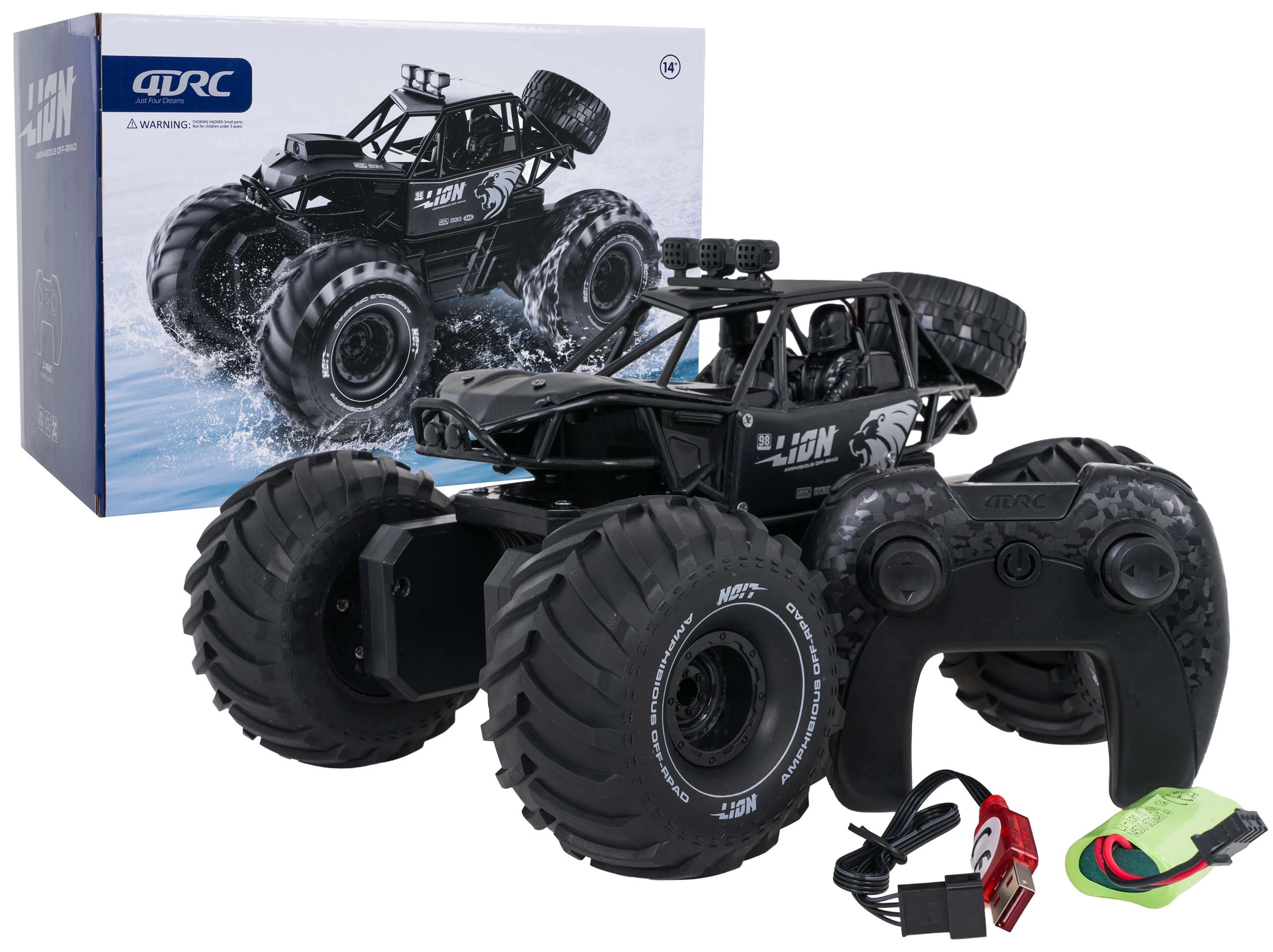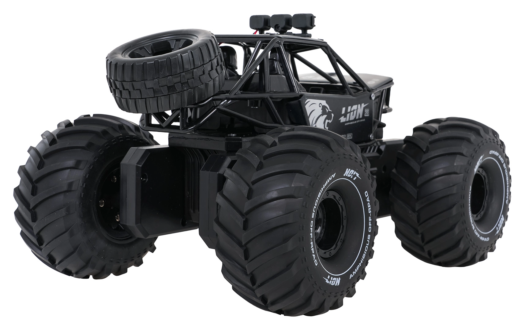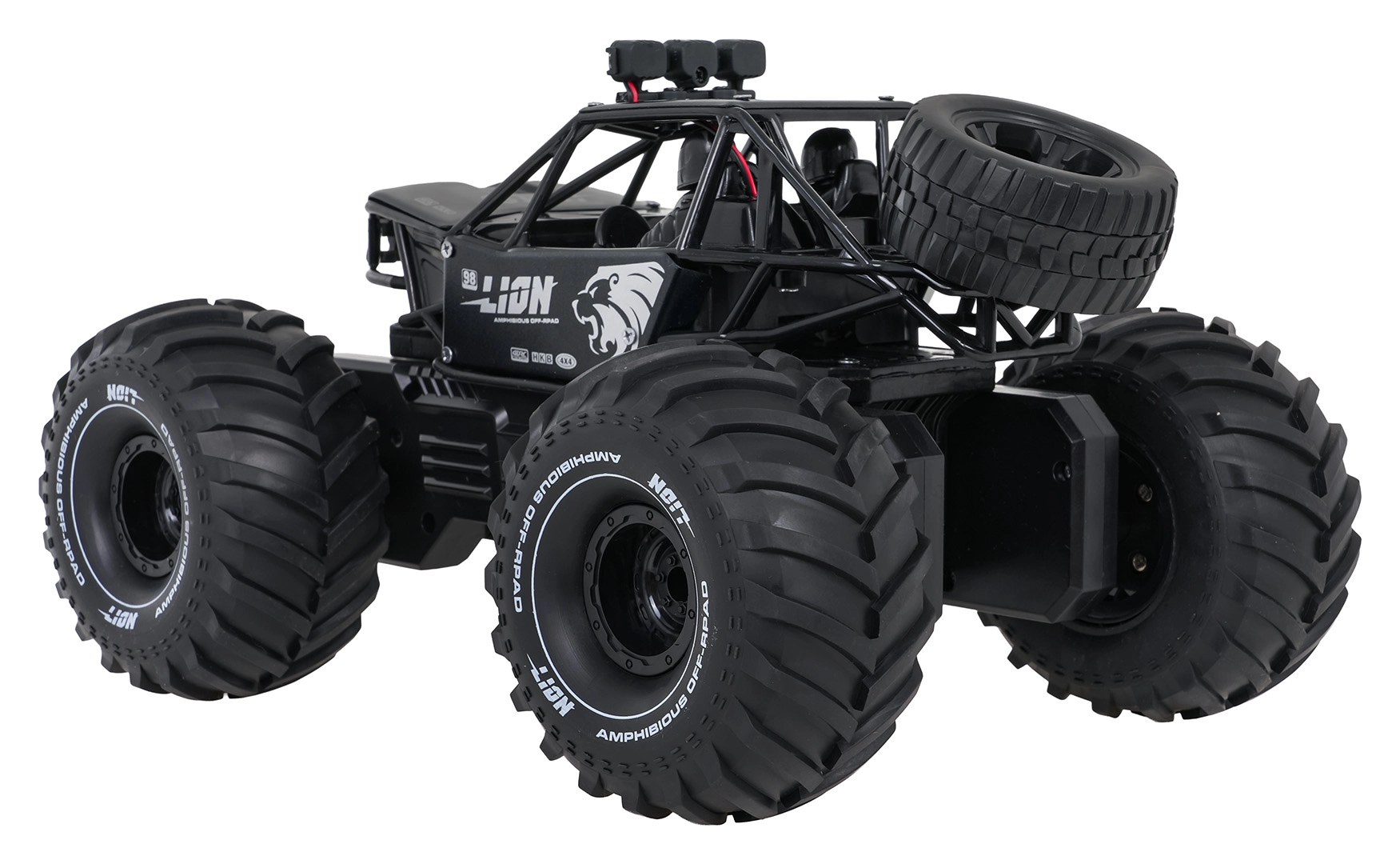 De RC terreinwagen LION in het zwart combineert een robuuste metalen carrosserie met 4x4-aandrijving voor zekerheid in het terrein. Grote, antislipbanden met een uitgesproken loopvlak kunnen grind, gras en oneffenheden aan, terwijl de antikol-constructie de auto beschermt bij botsingen. Besturing op 2,4 GHz zorgt voor een stabiel bereik zonder interferentie.