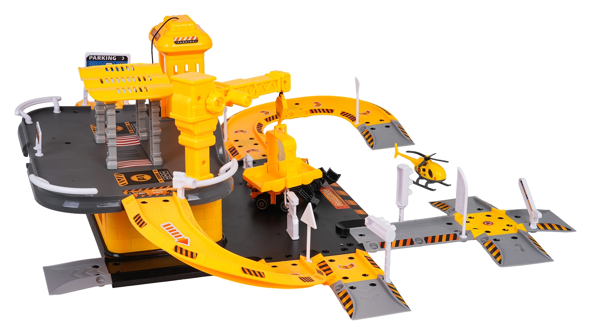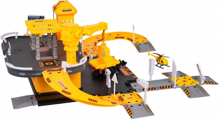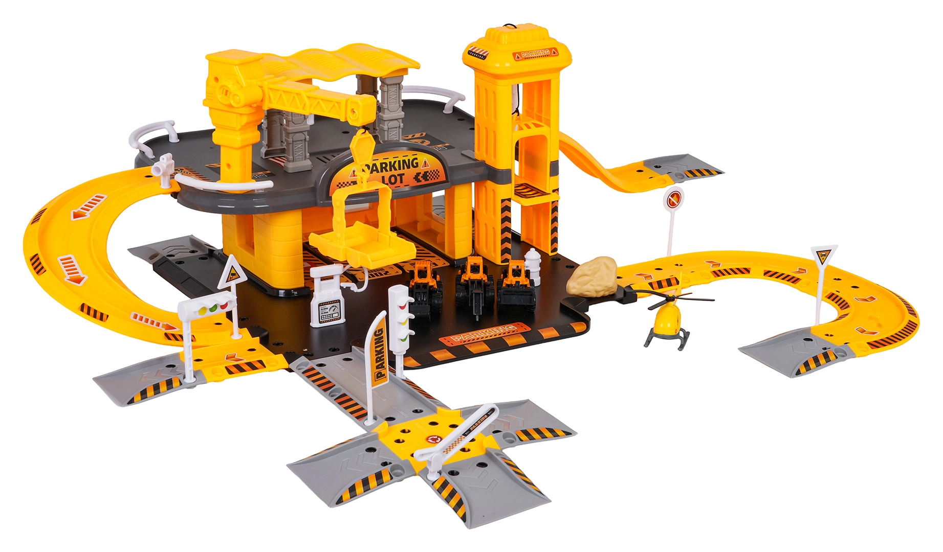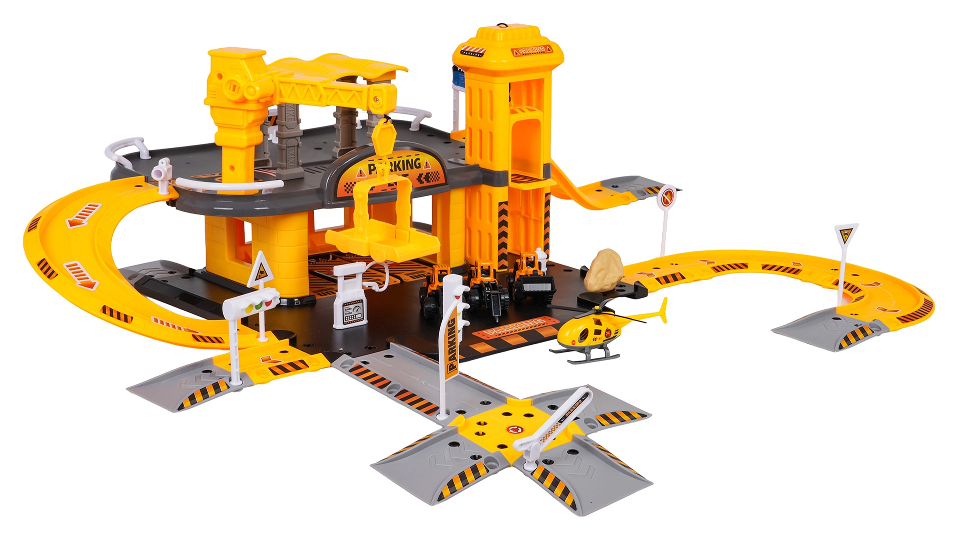 Deze gedetailleerde bouwparkeerplaats zal alle jonge fans van bouwmachines verrassen. Beneden vind je een tankstation en wegen; met de handlift breng je voertuigen naar de eerste verdieping, waar een bouwzone met werkende kraan is. De set is compact maar biedt veel speelmogelijkheden en soepele ritten over de spiraalhellingen.
