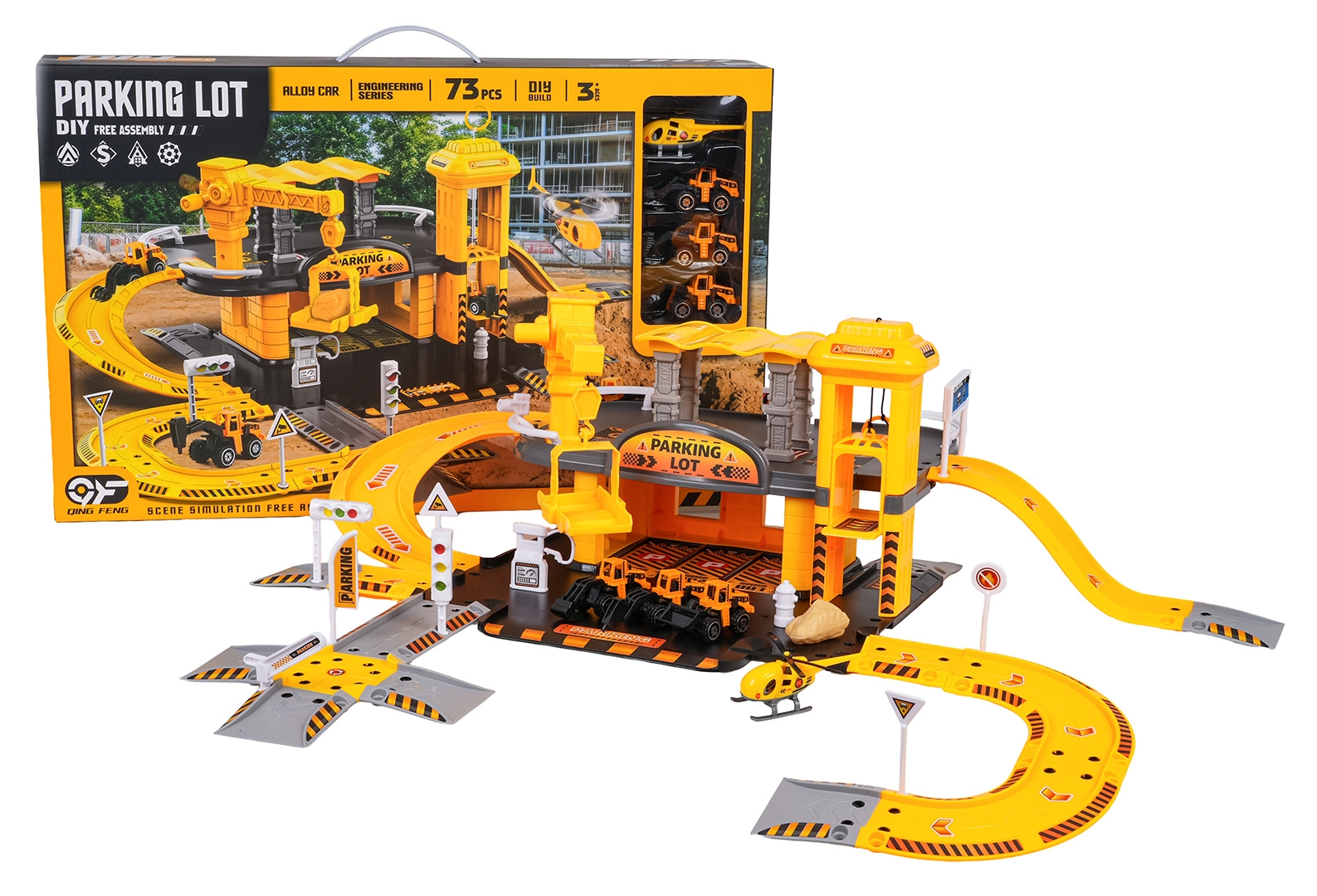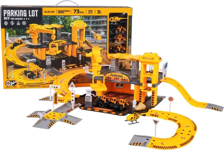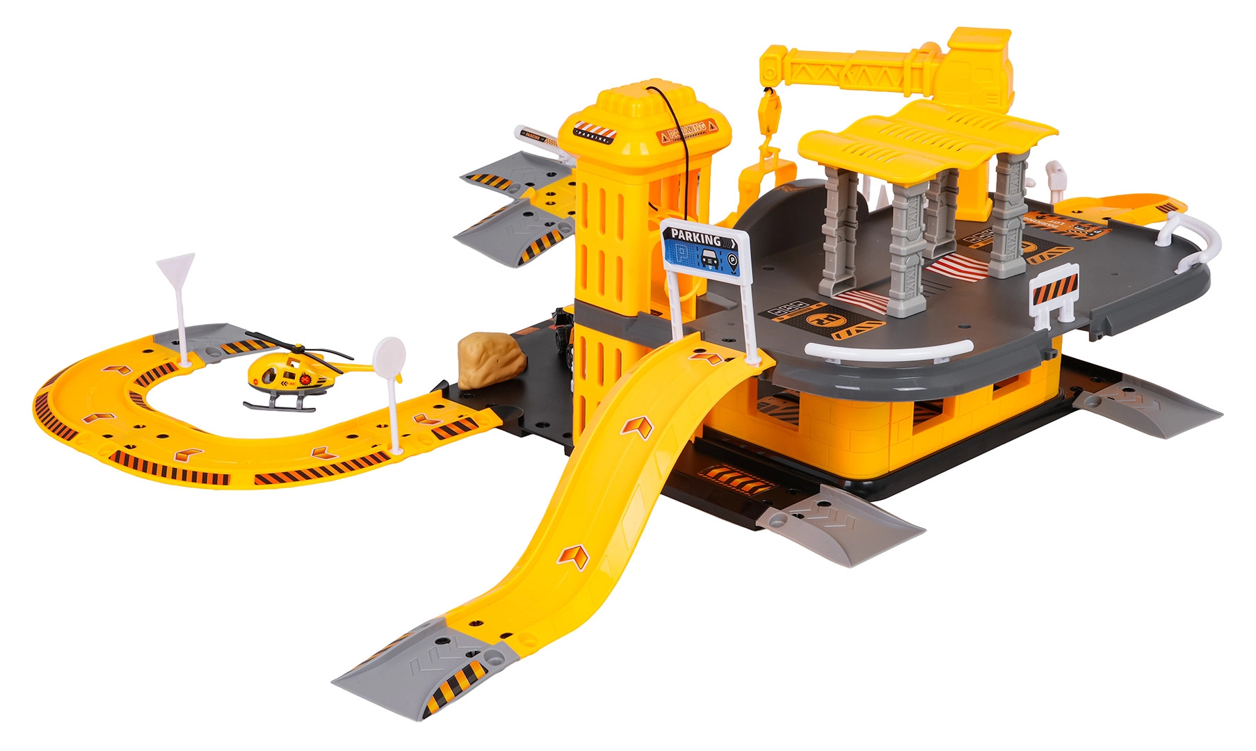 Deze gedetailleerde bouwparkeerplaats zal alle jonge fans van bouwmachines verrassen. Beneden vind je een tankstation en wegen; met de handlift breng je voertuigen naar de eerste verdieping, waar een bouwzone met werkende kraan is. De set is compact maar biedt veel speelmogelijkheden en soepele ritten over de spiraalhellingen.