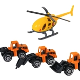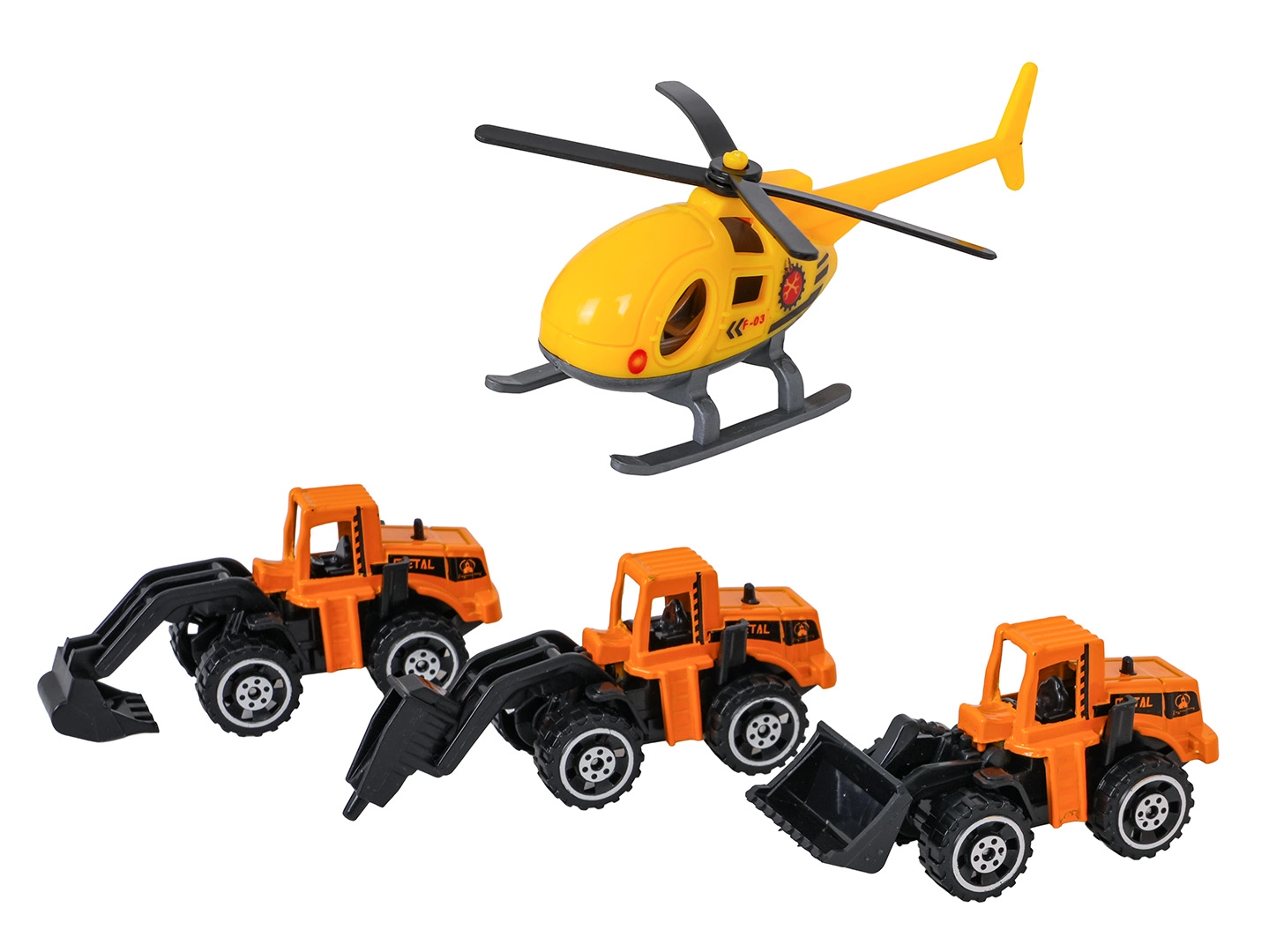 In de doos vind je drie metalen machines met bewegende delen en een gele helikopter voor interventies vanuit de lucht. Klaar voor actievolle missies op de bouwplaats.