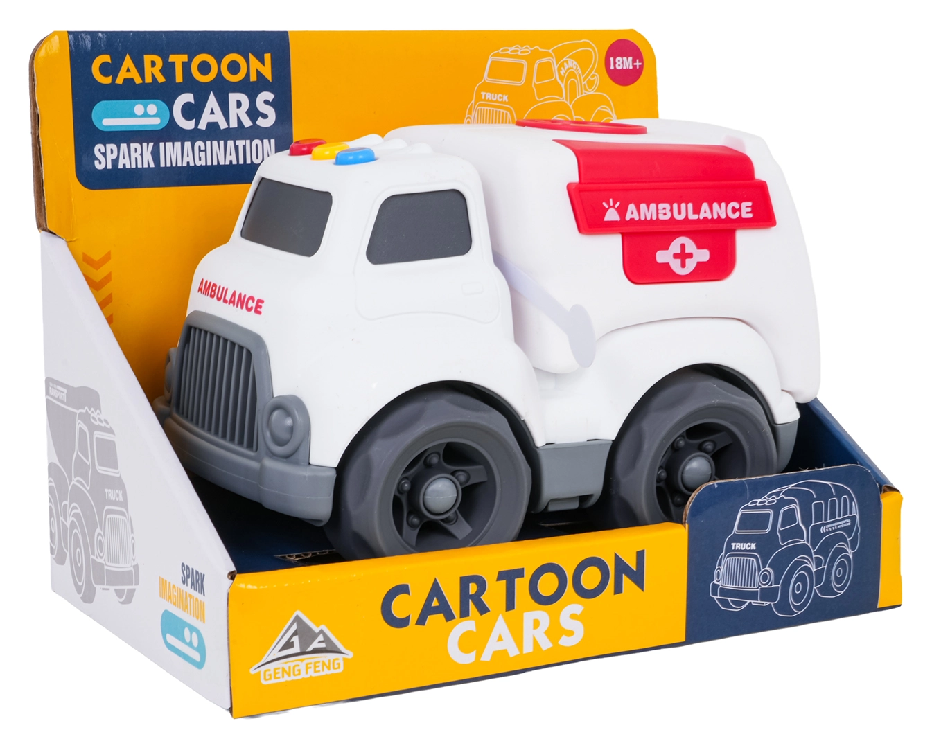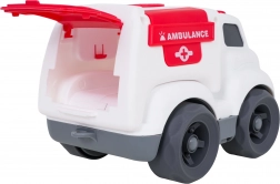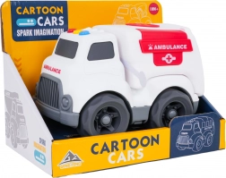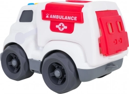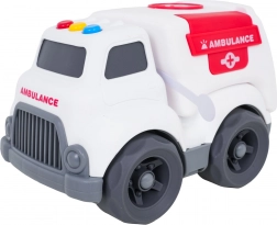 Schattig ambulancetje voor kinderen vanaf 18 maanden met veel speelplezier dankzij licht- en geluidseffecten, te openen achterdeuren en een veilige, afgeronde vorm zonder scherpe randen. Op het dak vind je gekleurde knoppen die het start-, rij- en achteruitrijgeluid en een vrolijke melodie activeren. Batterijen zijn inbegrepen, dus het spel kan meteen beginnen.