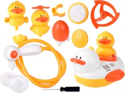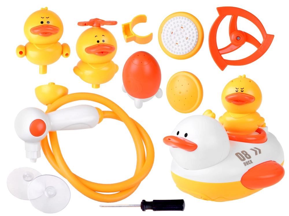 - 1 grote drijvende eend, 3 kleine eendjes, 1 handdouche met slang, 4 douche-opzetstukken, 2 zuignappen, 1 douchehouder, 1 schroevendraaier
