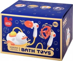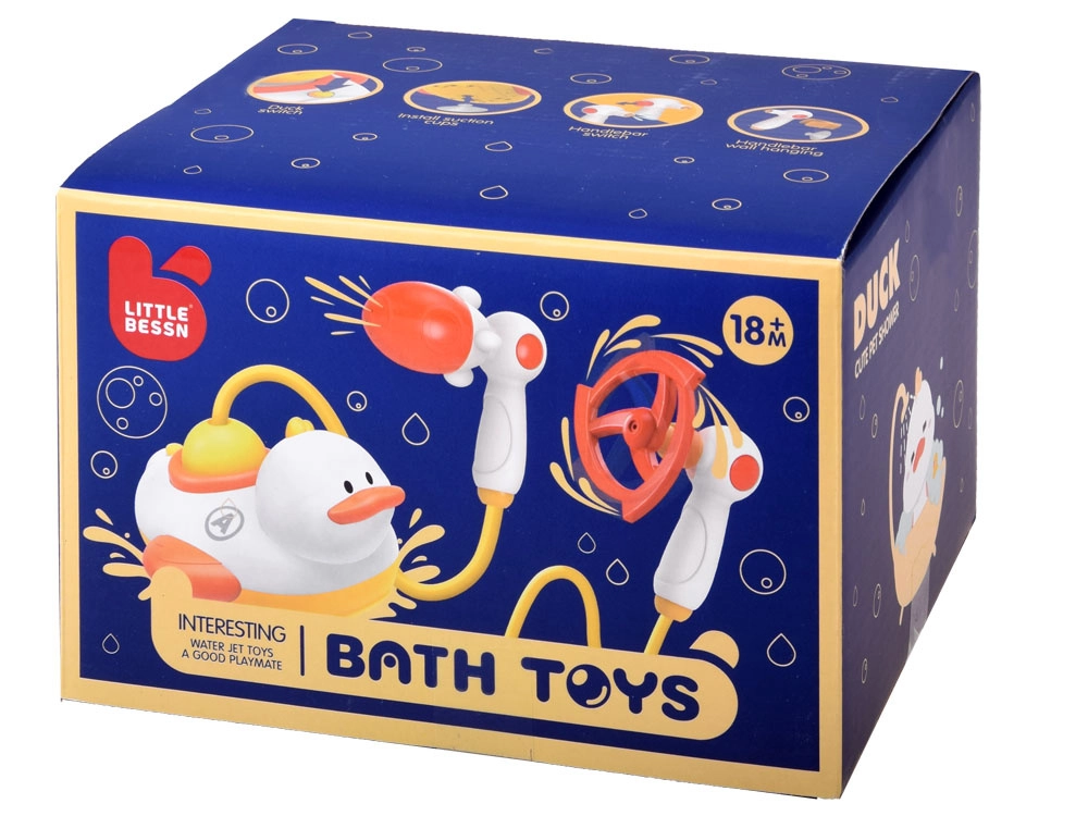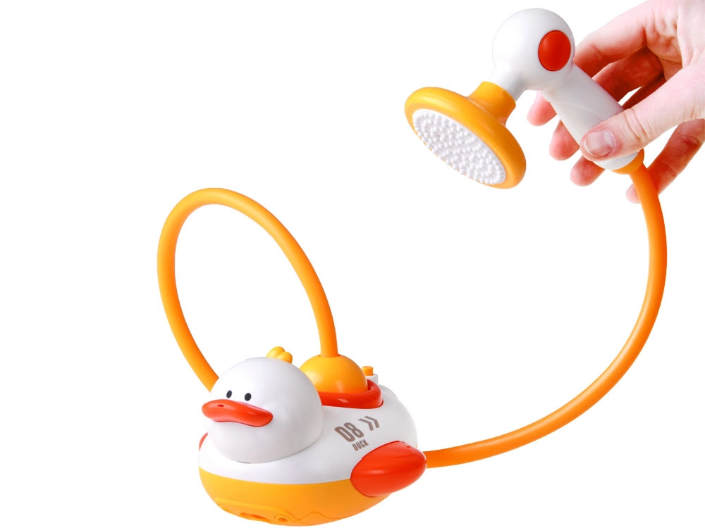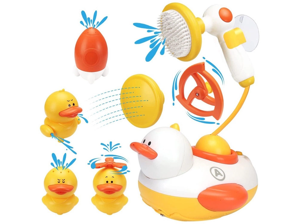 Leuke drijvende badeend verandert elk avondritueel in een vrolijk spel. Het motortje pompt water uit het bad en vernevelt, laat draaien en spuit het via verwisselbare opzetstukken op verschillende manieren. Inclusief een handdouche met meerdere sproeikoppen, zuignappen voor bevestiging en veilige afgeronde randen. Ideaal voor de ontwikkeling van fijne motoriek en oog-handcoördinatie.