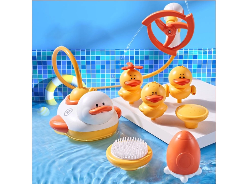 - 3 mini-eendjes: elk creëert een ander spuiteffect (uit de windmolen en snavel, uit de bovenkant van het kopje en snavel, uit de vleugels en snavel)