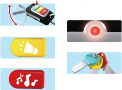 Interactieve sleutels met afstandsbediening zijn gemaakt voor kleine autoliefhebbers. De ergonomische vorm past in kinderhandjes en de kleurrijke elementen nodigen uit tot ontdekken. Kinderen kunnen het ontgrendelen van de auto, starten van de motor, rijden, remmen en achteruitrijden naspelen, toeteren met de claxon of vrolijke melodietjes afspelen die hen in een speelse stemming brengen.