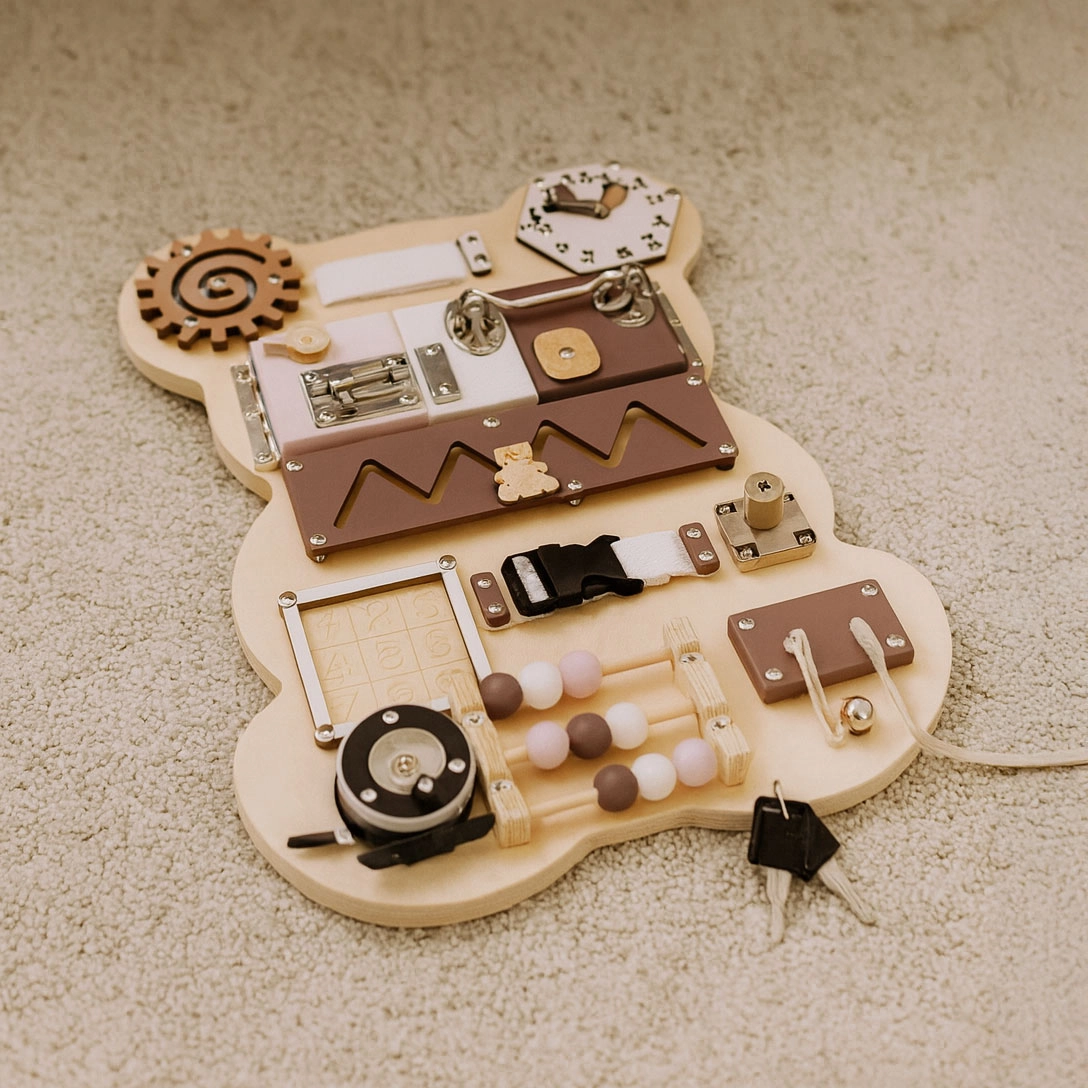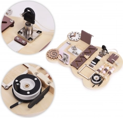 De busyboard stimuleert de zintuigen en biedt veilig experimenteren met mechanismen die uit het dagelijks leven bekend zijn. Spelenderwijs oefenen kinderen tellen op het kralentelraam, begrijpen ze de principes van oorzaak en gevolg en verwerven ze praktische vaardigheden die ook buiten het spel van pas komen.