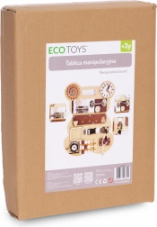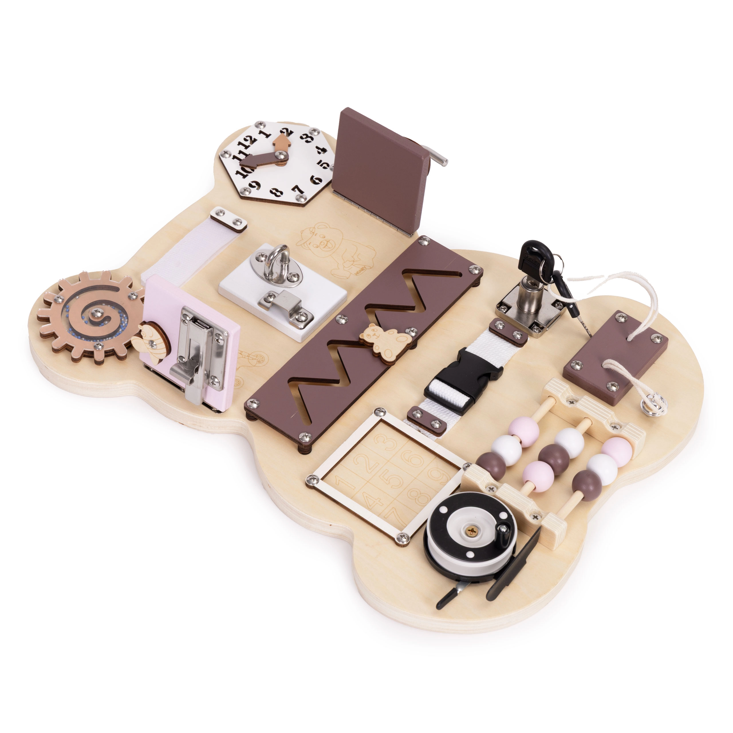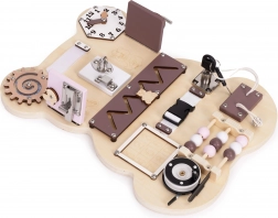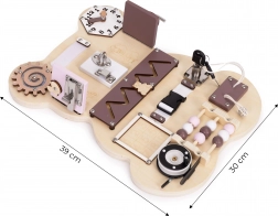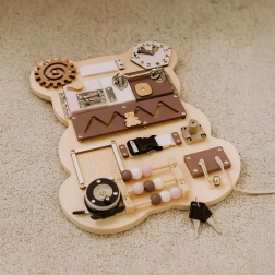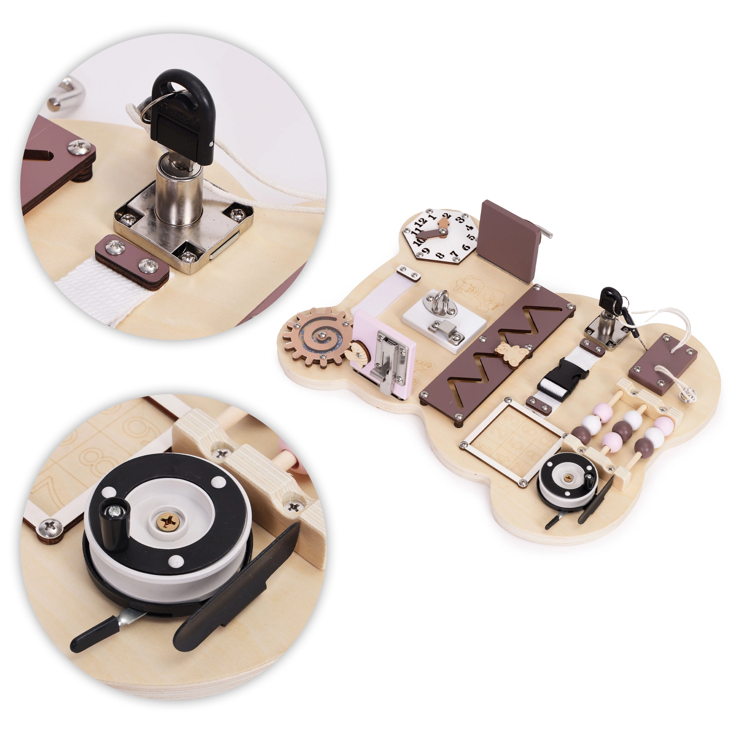 De houten activiteitenplaat ECOTOYS in de vorm van een beer is een doordacht educatief speelgoed voor kinderen vanaf 3 jaar. Dankzij de combinatie van hout, metaal en textiele elementen trainen kinderen grip, oog-handcoördinatie en geduld. De rijke variatie aan onderdelen – van een slot met sleutel en tandwielen tot een bewegende klok – nodigt uit tot ontdekken en bevordert zelfstandigheid.