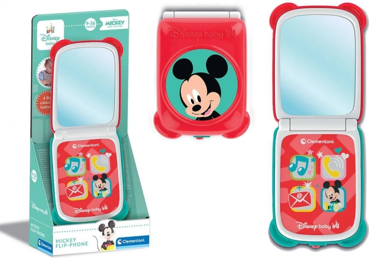 Clementoni Baby Mickey opklapbare smartphone voor kinderen 9–36 maanden. 4 lichtgevende knoppen, spiegelend scherm, ondersteunt motoriek. Batterijen inbegrepen.