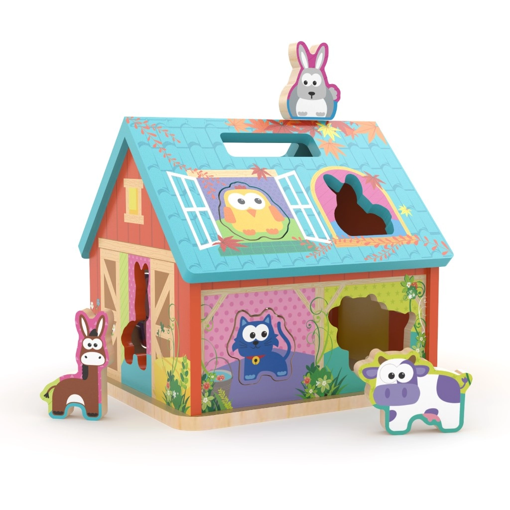 Ontdek de charme van het leven op de boerderij met deze schattige houten inlegpuzzel in de vorm van een huisje. Het speelgoed van hoogwaardig, natuurlijk hout stimuleert de fijne motoriek, oog-handcoördinatie en het leren van vormen, dieren en kleuren. De onderdelen hebben gladde randen, veilige niet-giftige verf en liggen prettig in kleine kinderhandjes.