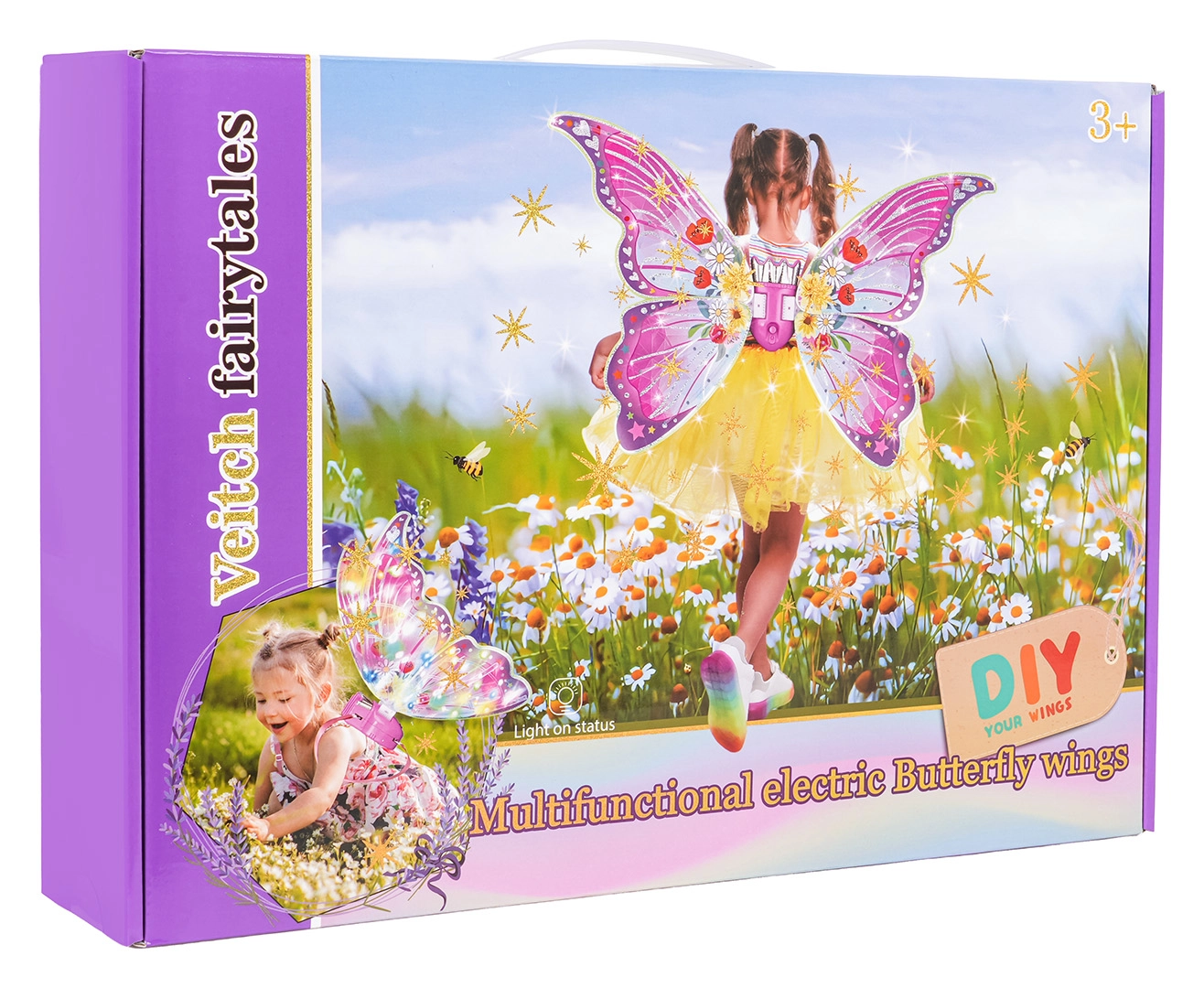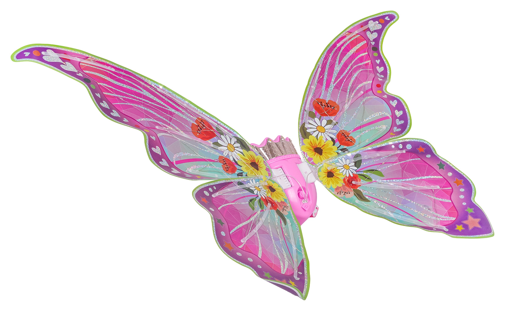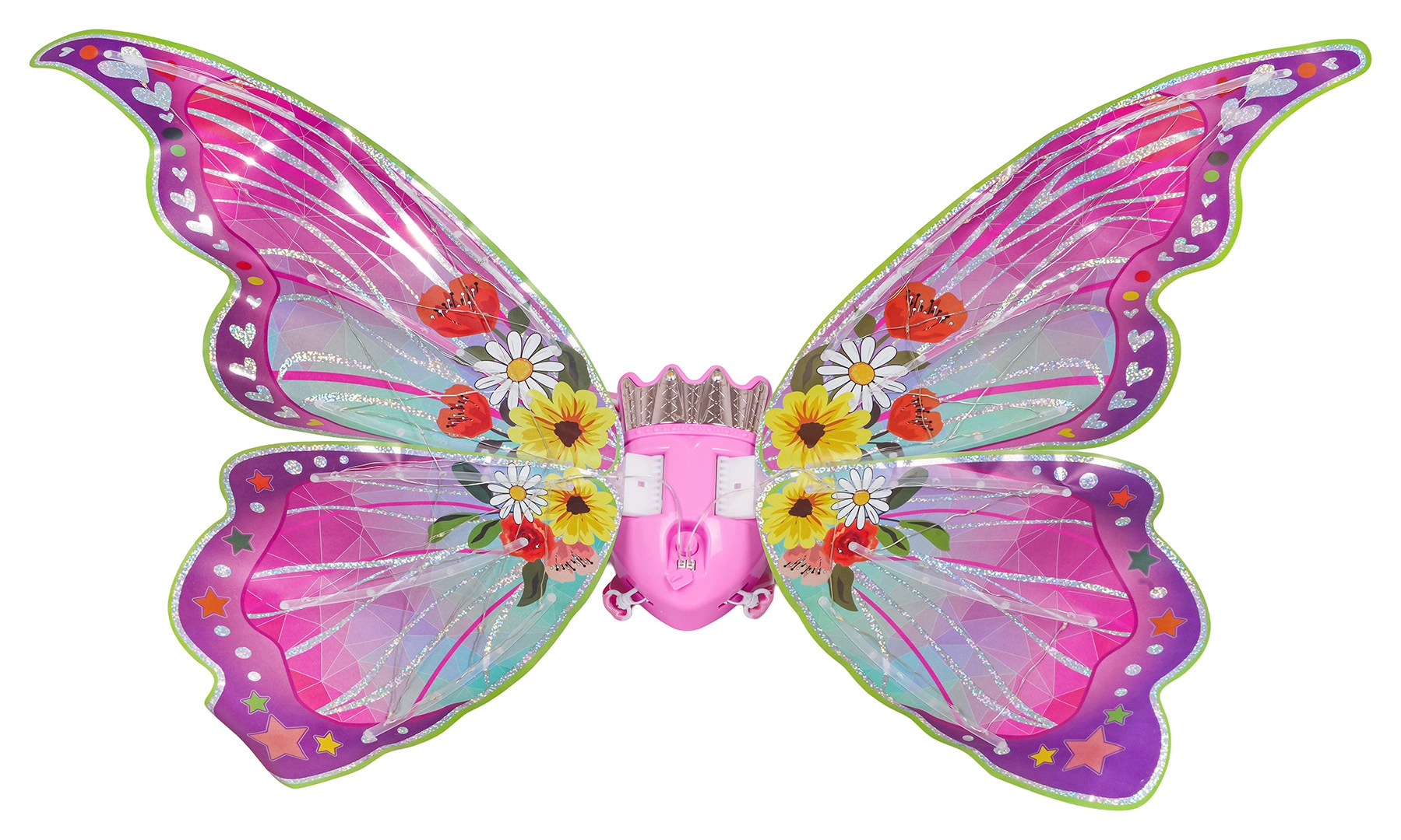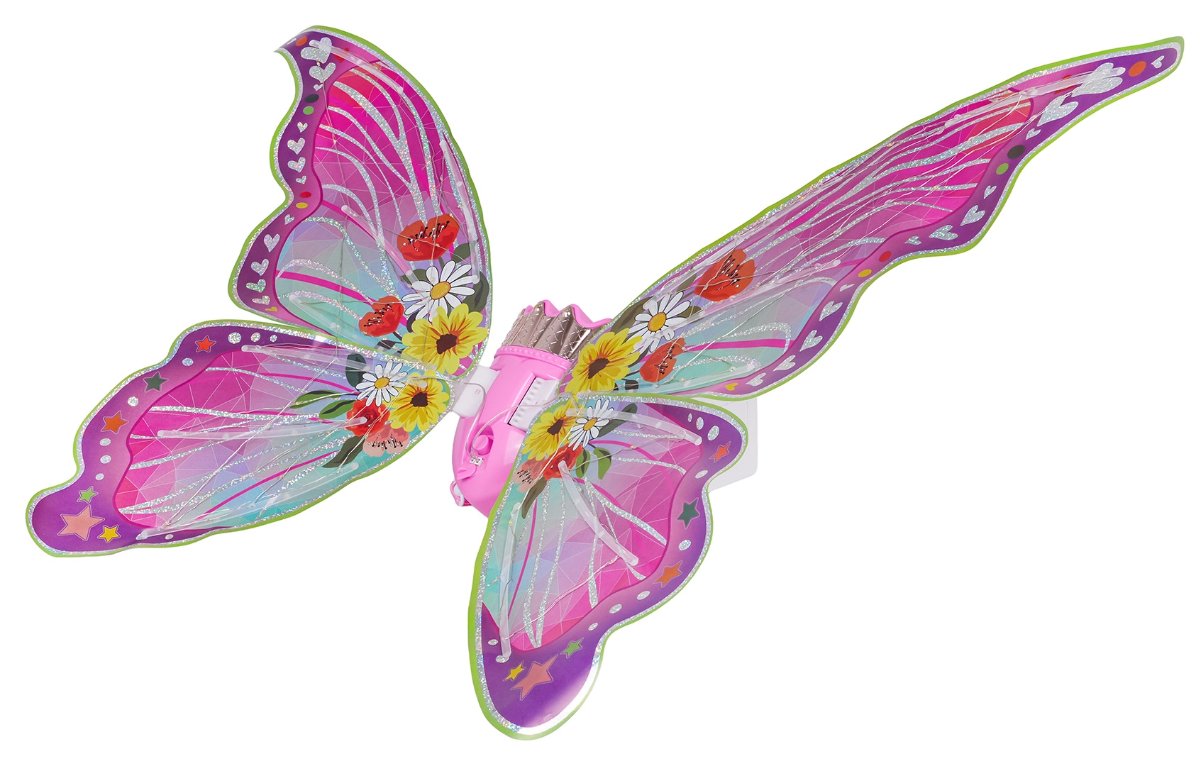 Kleurige vleugels met LED-lichtjes en wapperfunctie bieden standen met licht, knipperen en muziek – voor maximaal betoveringseffect bij elk spel.