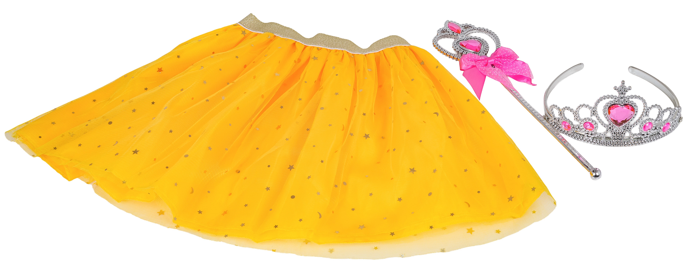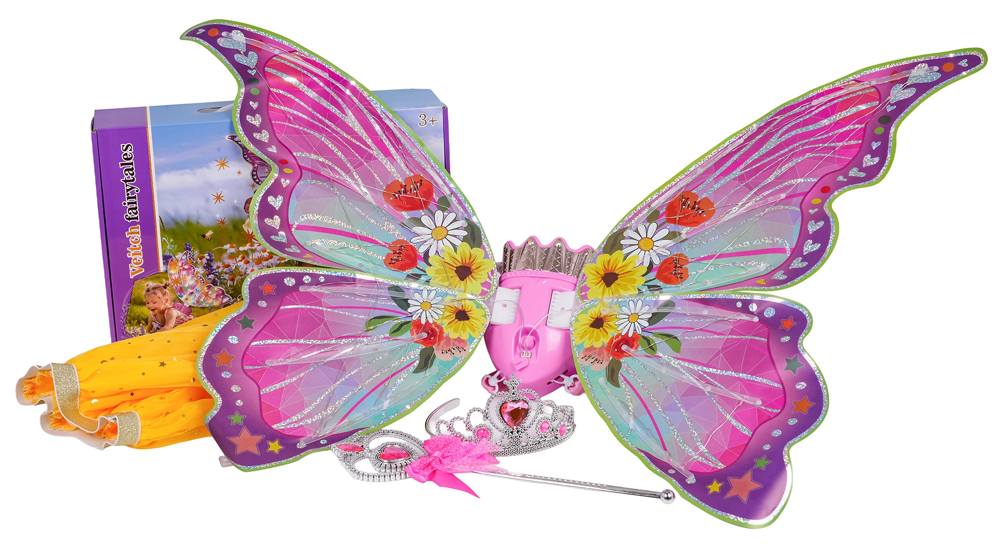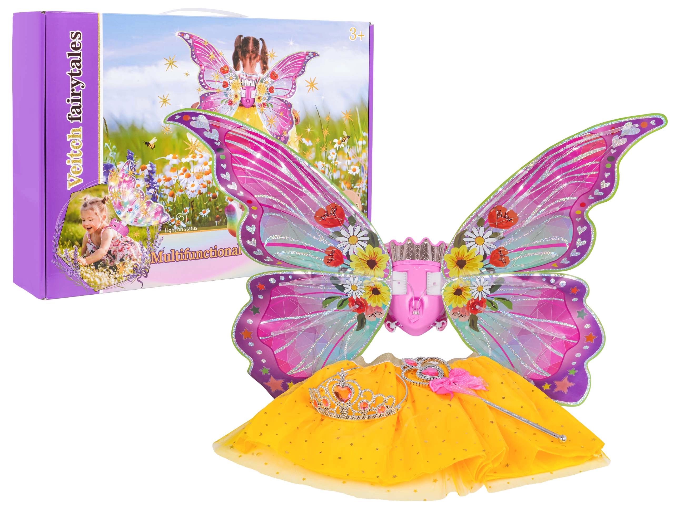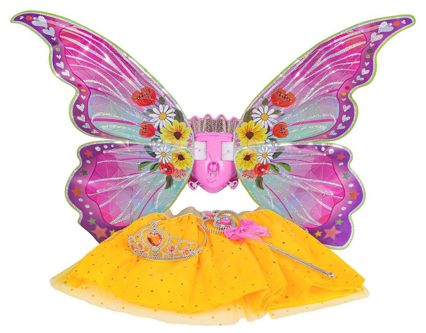 - vlindervleugels met licht en geluid, gele rok, toverstok, kroon