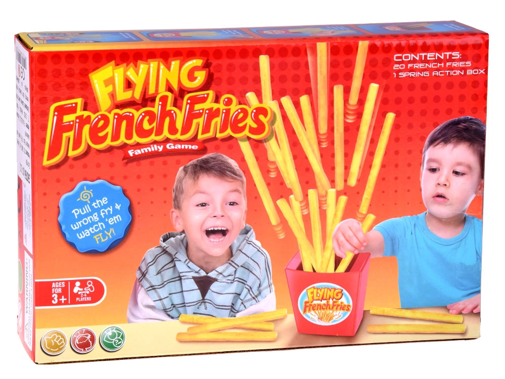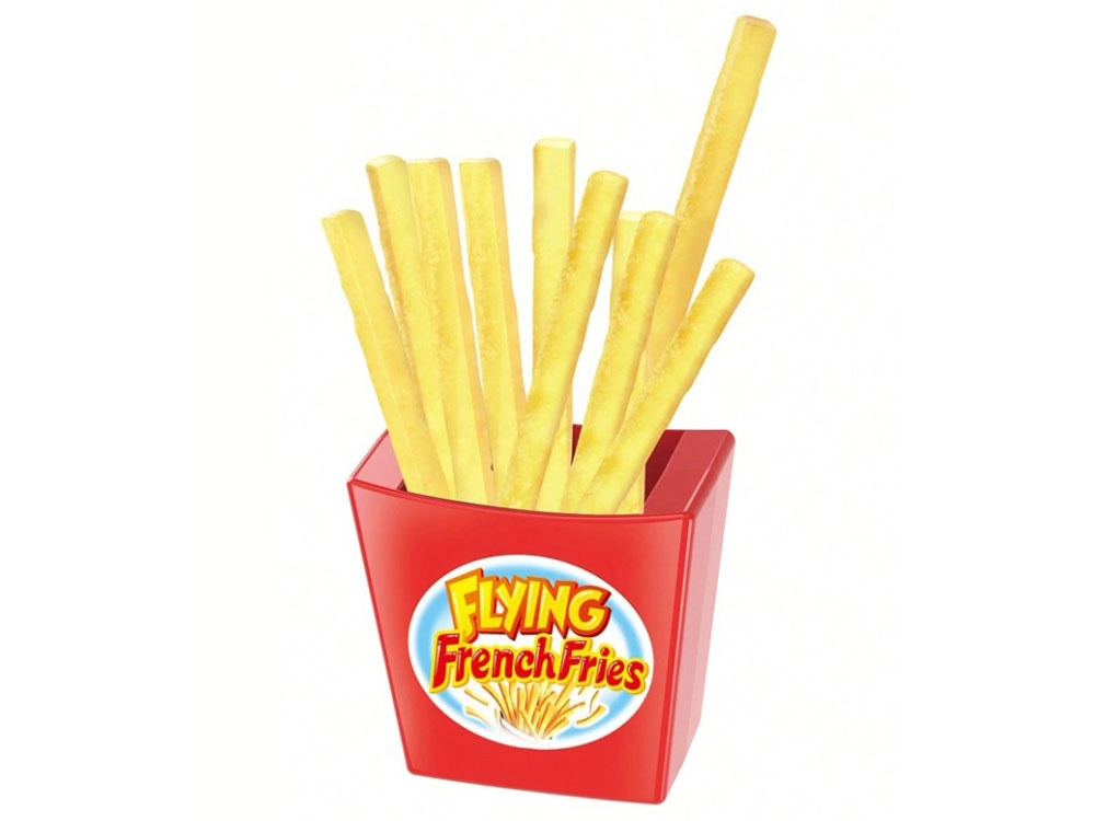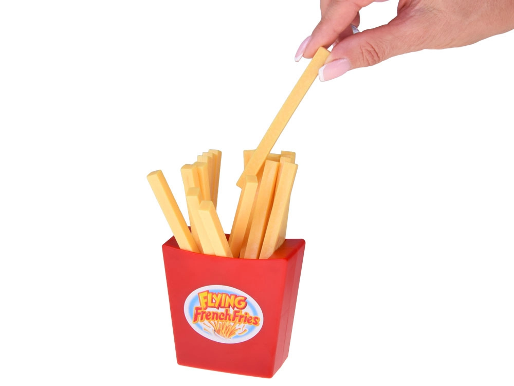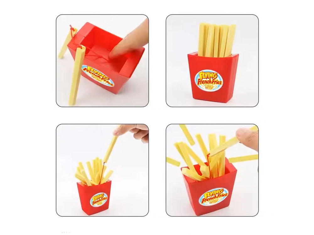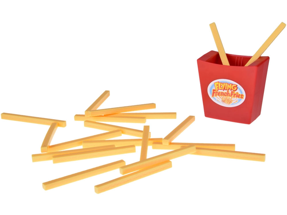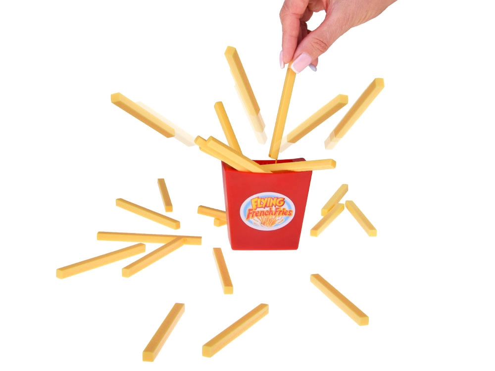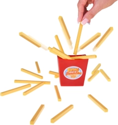 Druk het mechanisme in, vul het bekertje en trek de frietjes één voor één eruit. Eén verkeerde zet activeert het mechanisme en zorgt voor een lachsalvo.