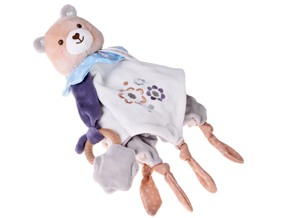 Deze schattige knuffel voor baby’s combineert een pluchen beertje, een zacht kalmerend dekentje en een houten-look bijtring in één. Biedt verschillende texturen, geborduurde details en knoopjes voor makkelijk vastpakken, die de sensomotorische ontwikkeling ondersteunen en vanaf de eerste levensdagen een gevoel van geborgenheid geven.