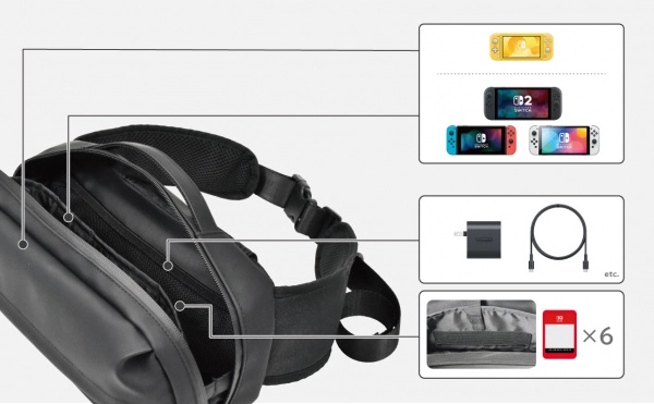 Het hoofdvak beschermt je console tegen krassen en lichte stoten, terwijl het praktische buitenvak accessoires zoals Joy‑Con-controllers, kaartjes, kabels of oordopjes altijd binnen bereik houdt. De verstelbare schouderriem en het bovenste handvat bieden twee draagstijlen – over de schouder of in de hand.
