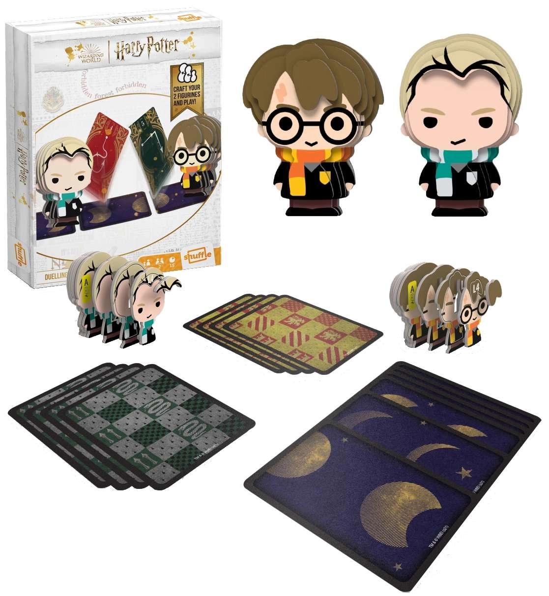 In de doos vind je kleurrijk geïllustreerde kaarten en personagestandaards die de sfeer van de wereld van HARRY POTTER versterken. Elke ronde biedt nieuwe tactische keuzes: wanneer werp je een aanvalsspreuk, wanneer gebruik je een toverdrank en wanneer wacht je op de tegenaanval. Geniet van vlotte gevechten, bekende spreuken en personages uit de boeken en films.