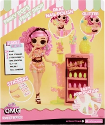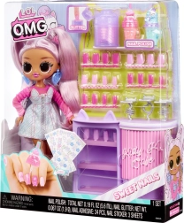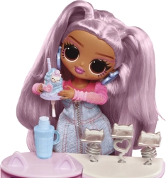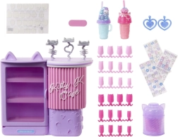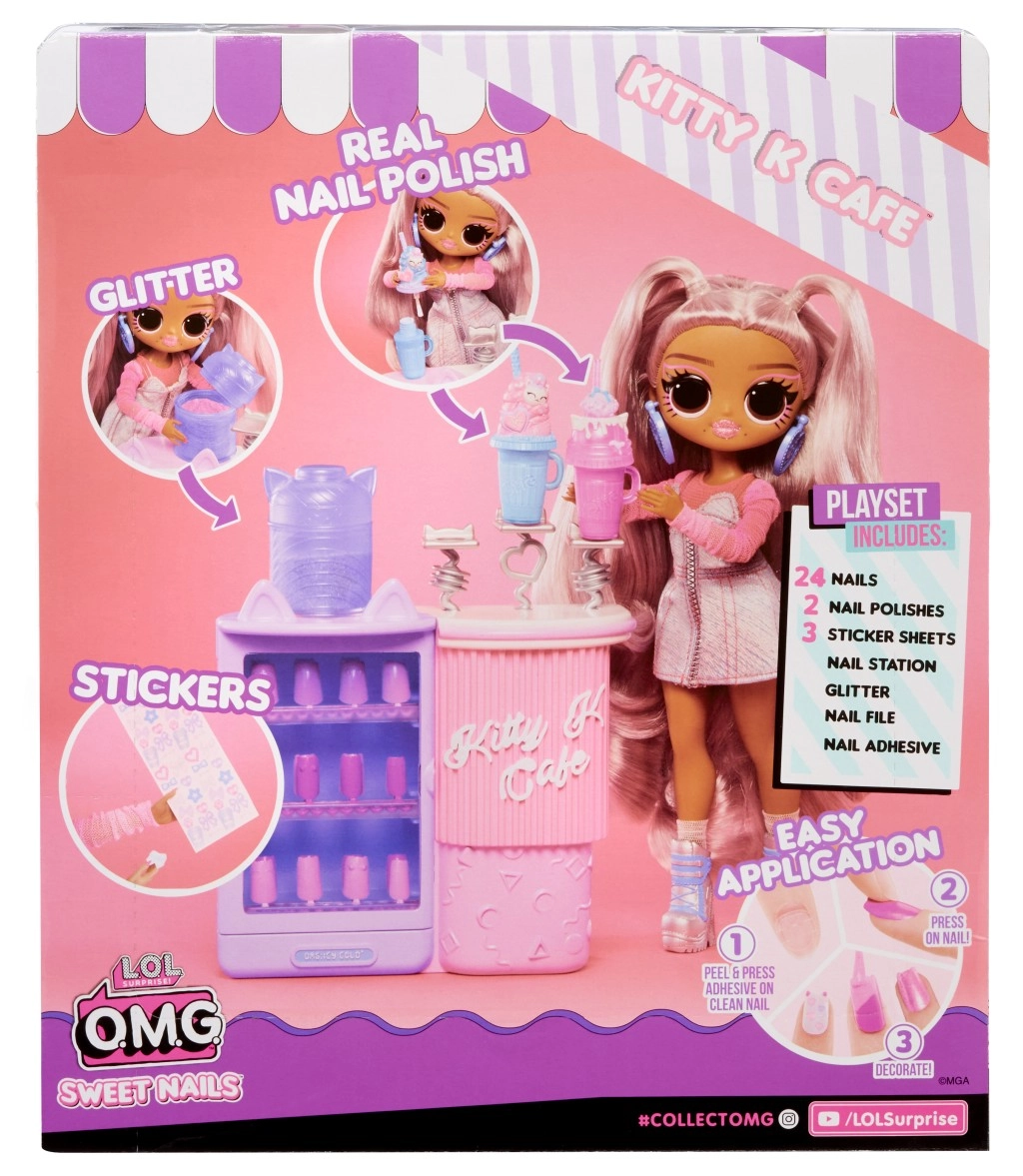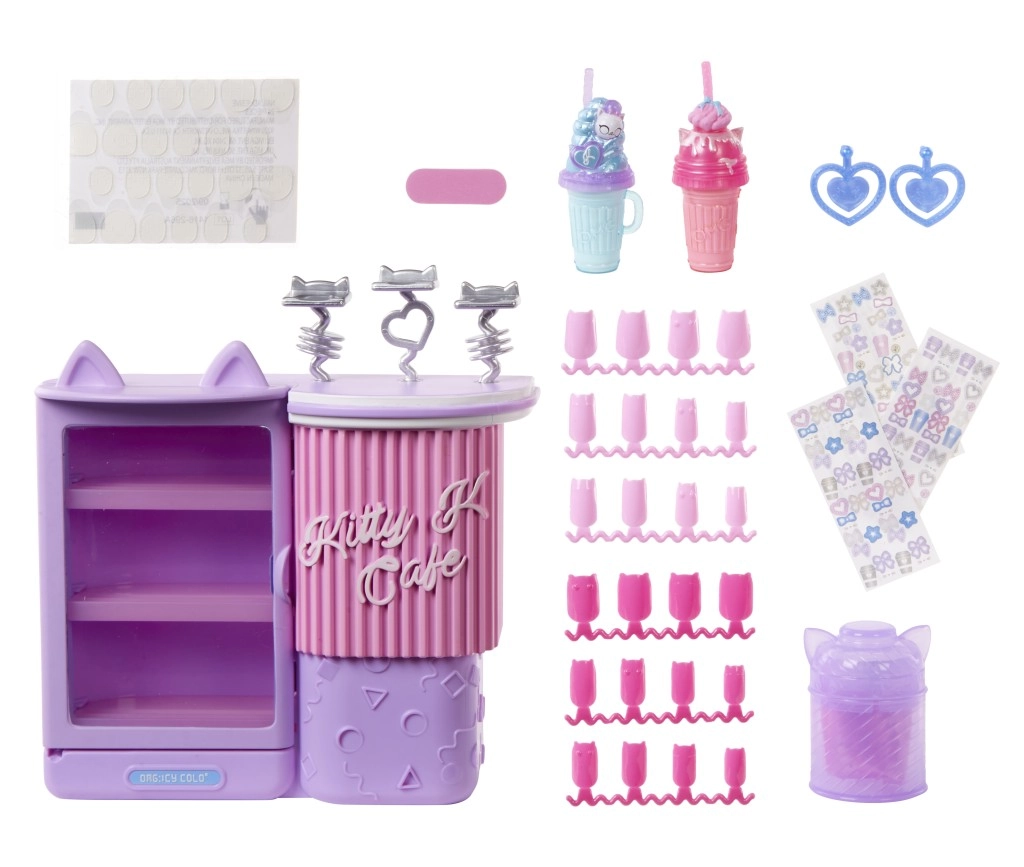 De set bevat een modepop met lang pastelhaar en een gearticuleerd lichaam voor geweldige poses, de Kitty K Cafe balie met accessoires om drankjes te serveren en een uitgebreide set nageldecoraties. Ideaal voor creatief spel, verzamelen en uitstallen.