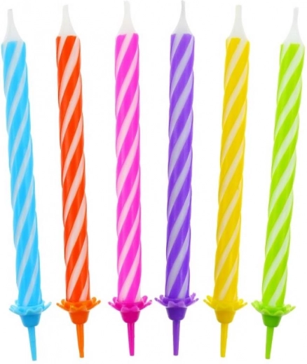 De set bevat 24 kaarsjes in populaire kleuren (blauw, rood, roze, paars, geel, groen) en 12 praktische houders die een stabiele plaatsing op de taart vergemakkelijken. De kaarsjes zijn zowel esthetisch als functioneel – de ideale keuze voor snelle en effectieve decoratie.