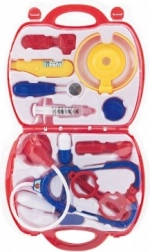 Deze kleurrijke doktersspeelset voor kinderen biedt een uitgebreide uitrusting voor doktertje spelen – van stethoscoop tot thermometer en spuit. Alles is opgeborgen in een stevig, licht koffertje met een robuust handvat, zodat kinderen hun praktijk overal kunnen openen. Spel helpt op natuurlijke wijze angst voor onderzoeken te verminderen en maakt kinderen vertrouwd met medische hulpmiddelen.