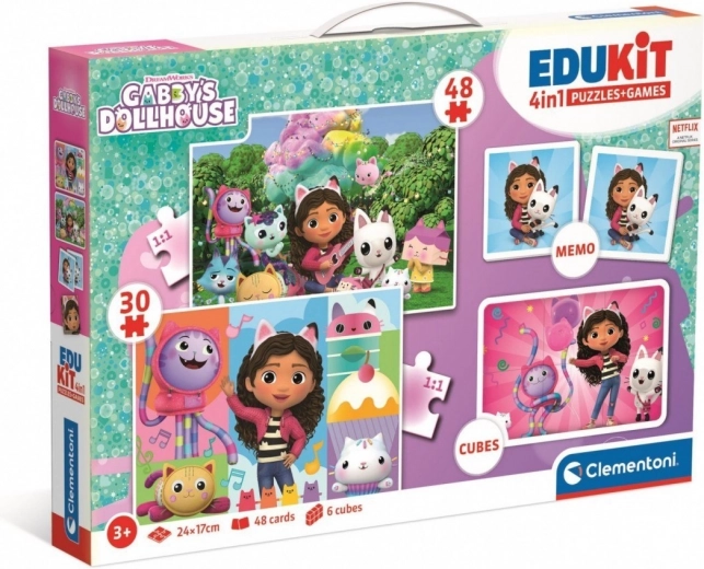 Ontdek de leuke educatieve set EduKit 4 in 1 Gabby’s Poppenhuis van Clementoni, waarin leren en spelen samenkomen. Kinderen zullen genieten van twee puzzels (30 en 48 stukjes), een memoryspel en 6 bouwblokken met kleurrijke illustraties van favoriete personages. Stimuleert geheugen, logisch denken, observatievermogen en fijne motoriek – een ideaal cadeau voor kinderen vanaf 3 jaar.