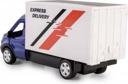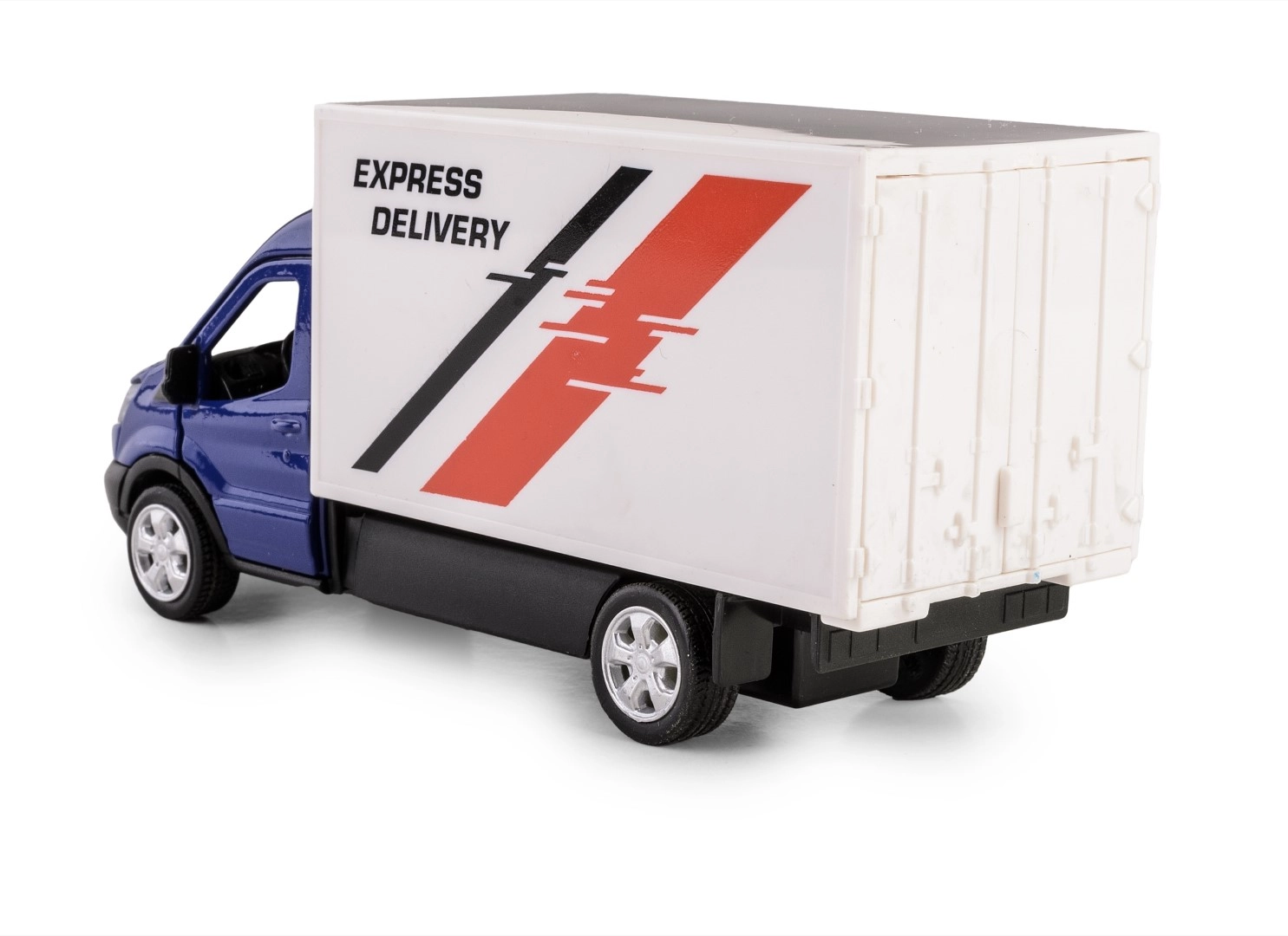 Dankzij de openende deuren kijk je in het interieur en het pull-back mechanisme schiet de auto na het terugtrekken naar voren. De realistische look wordt versterkt door de blauwe lak, zilverkleurige velgen en de opvallende Express Delivery opdruk.