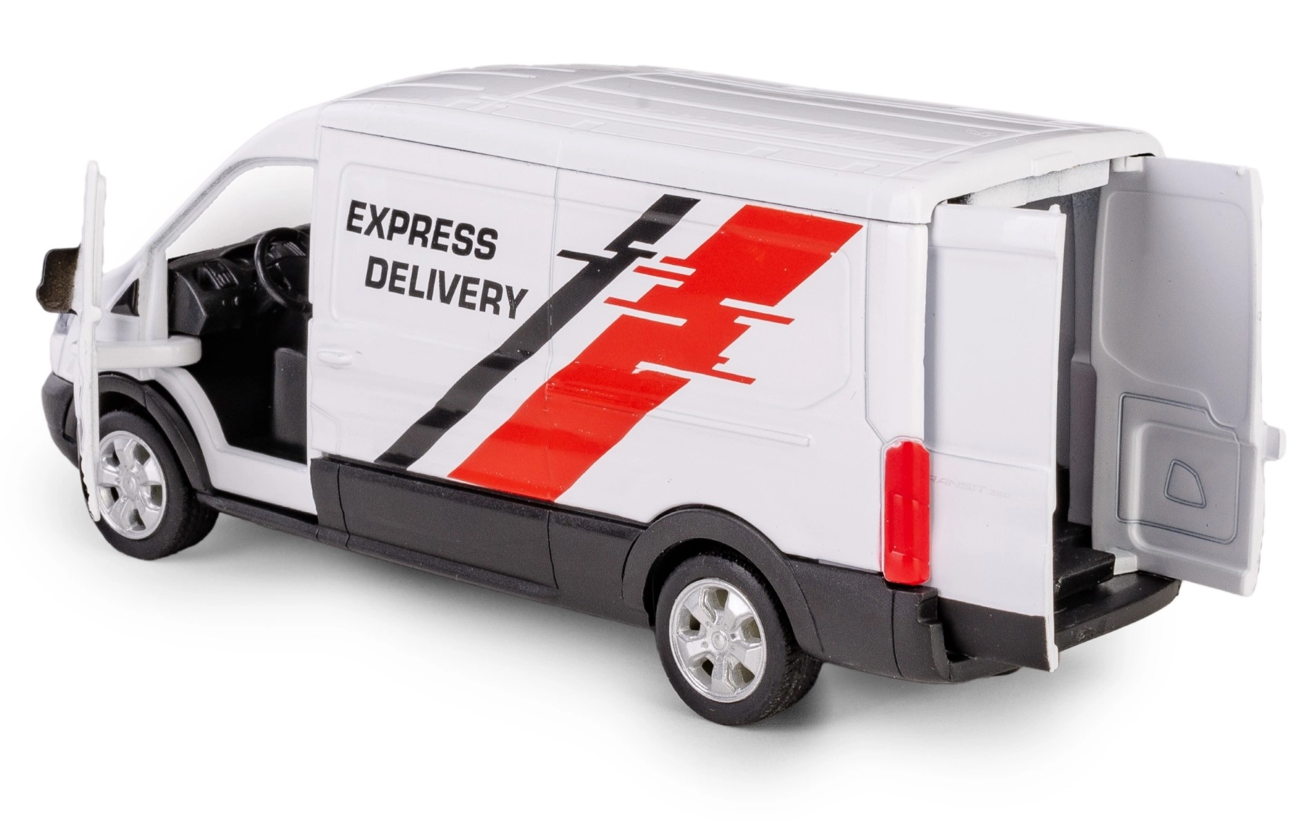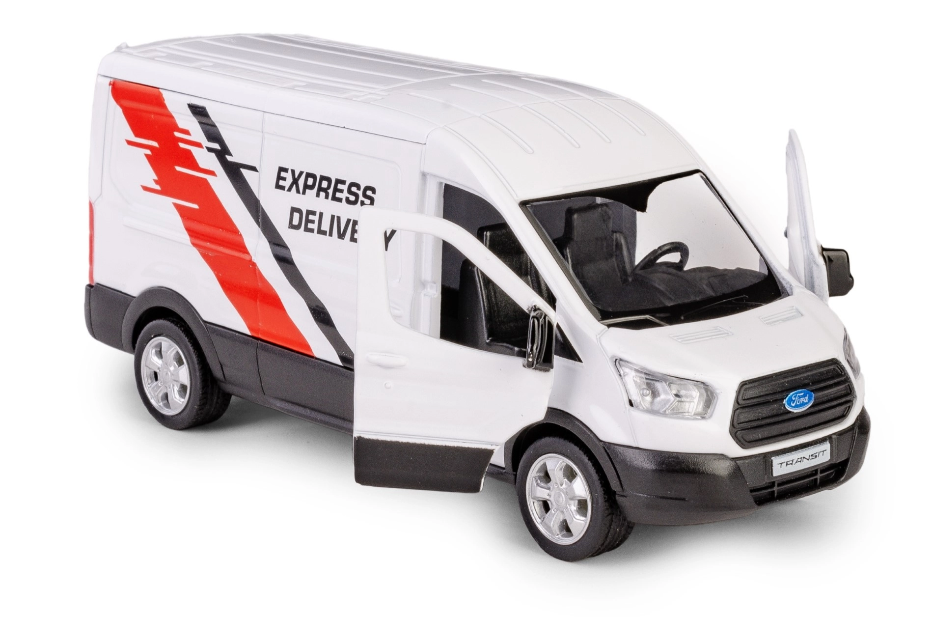 Getrouwe proporties van de FORD TRANSIT, een opvallende witte carrosserie en bezorggraphics die zowel kinderen als verzamelaars zullen bekoren.