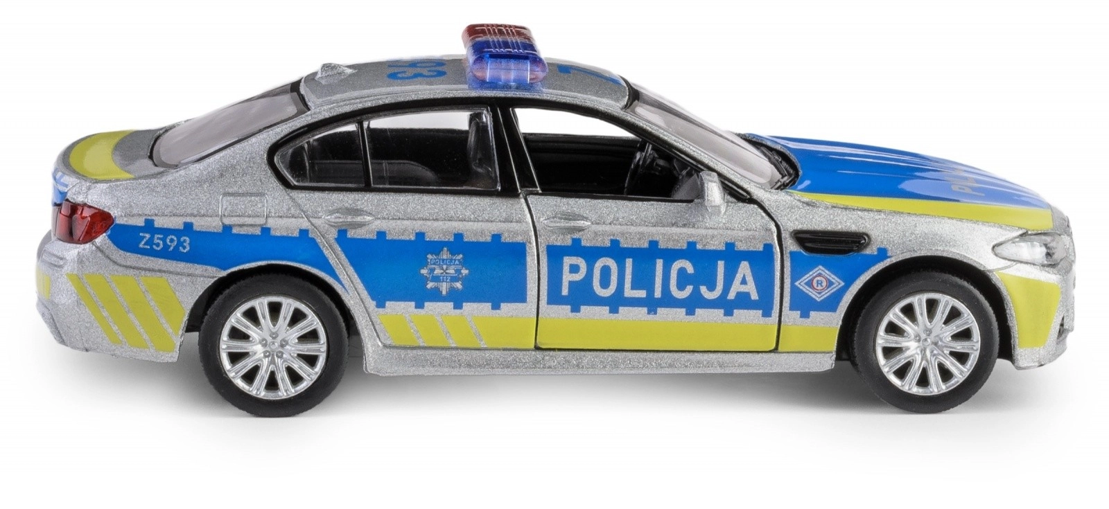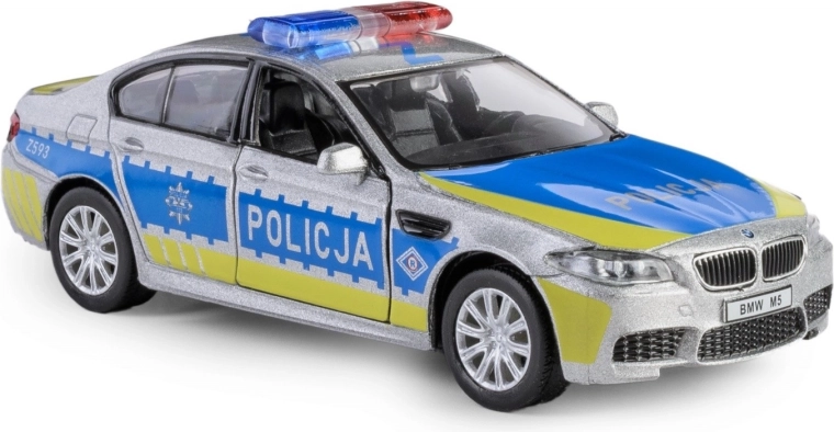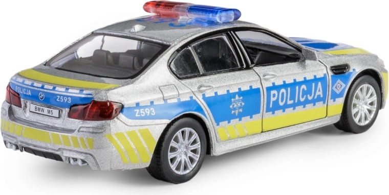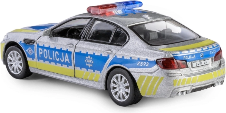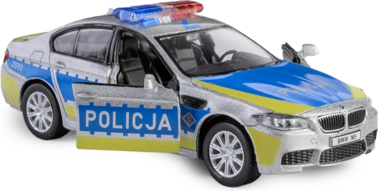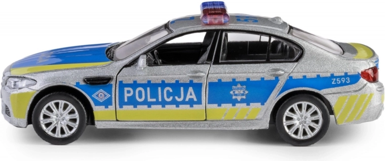 Ontdek de gedetailleerde replica van de BMW M5 in politie-uitvoering, met een metalen carrosserie, nauwkeurig uitgewerkt interieur en functionele elementen. Het model op schaal 1:32 is uitgerust met een praktische pull-back aandrijving – trek hem naar achteren en de auto rijdt naar voren.