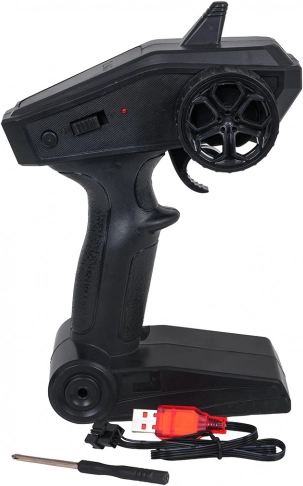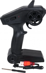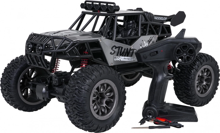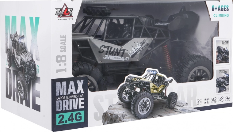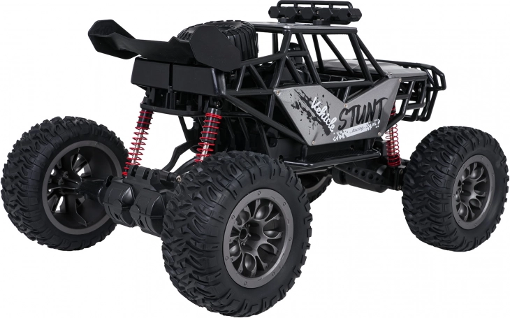 Dankzij de vierwielaandrijving 4x4, hoge bodemvrijheid en onafhankelijke veerophanging klimt het model gemakkelijk over obstakels en voert het stunttrucs uit. Koplampen en een LED-paneel op het dak verbeteren de zichtbaarheid en zorgen voor een aantrekkelijk uiterlijk. Handige voeding via een 7,4 V-accu (inbegrepen) bespaart batterijen; de controller vereist 4× AA (niet inbegrepen).