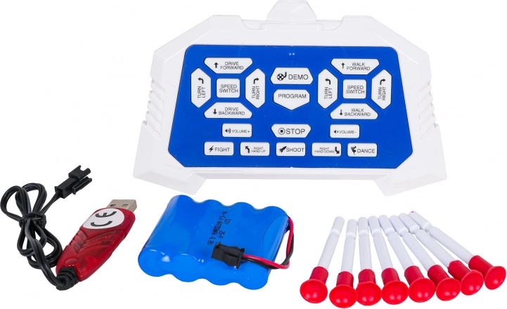 In de verpakking zit een oplaadbare 4,8 V 700 mAh Ni-Cd-accu met USB-opladen en een set van 8 pijltjes met zuignap. De robot rijdt vooruit en achteruit, stuurt naar rechts en links, kan glijden en een 360° draai maken. Het afvuren van de pijltjes heeft een bereik van circa 5 m. De DEMO-modus toont alle vaardigheden met één druk op de knop en de meerstaps volumeregeling zorgt voor comfortabel gebruik, zowel binnen als buiten.