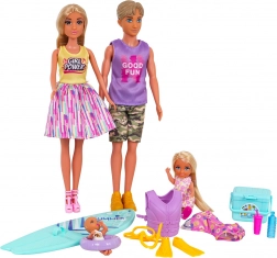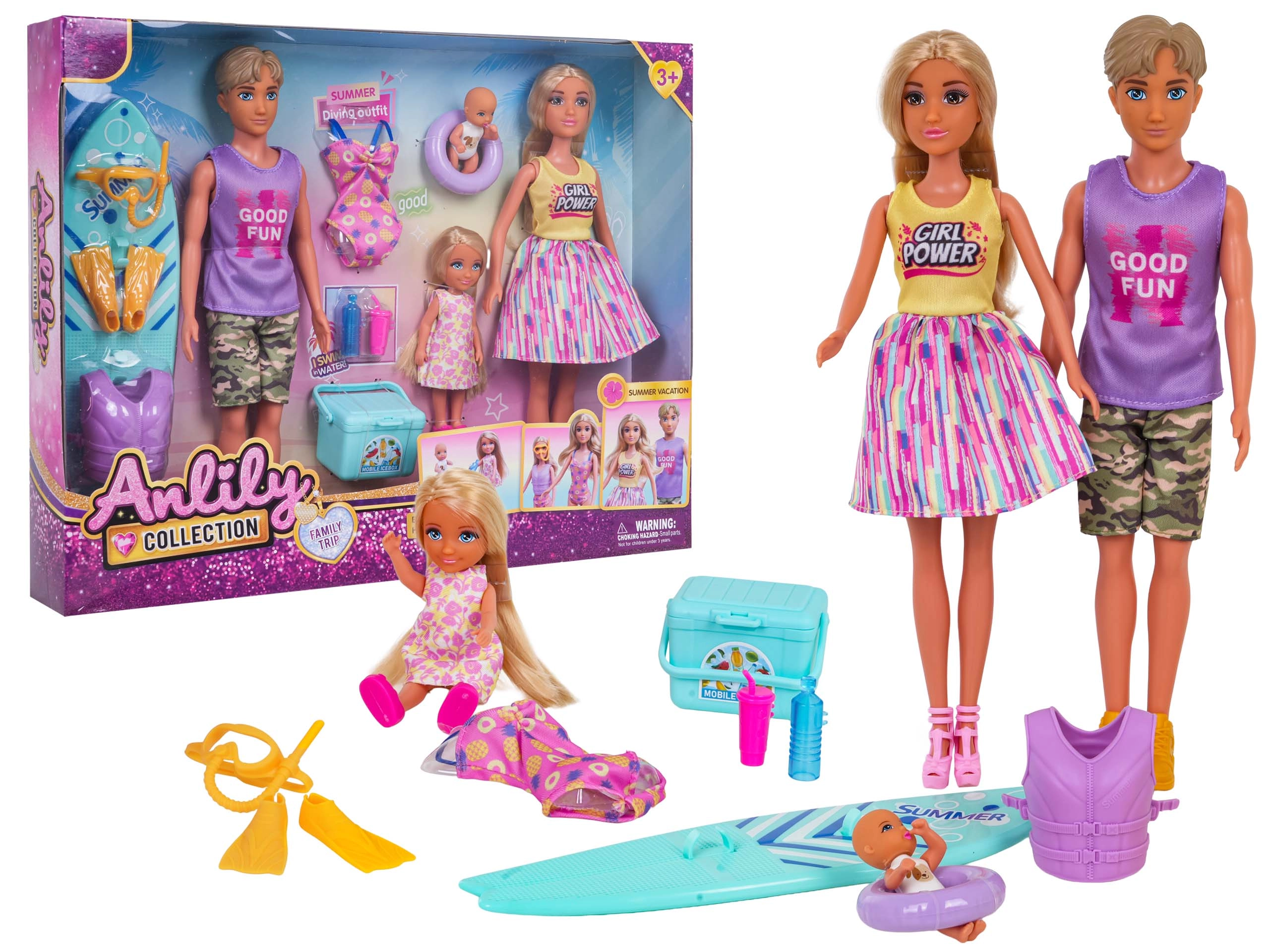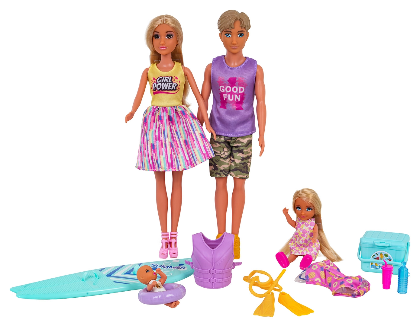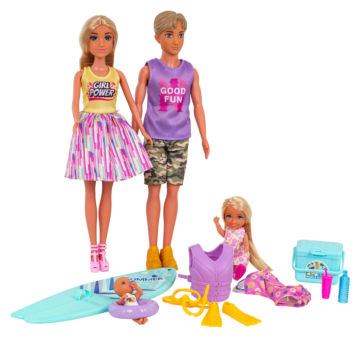 Geniet van zomerse avonturen met deze familie strandset – mama, papa, dochtertje en baby, plus tal van accessoires voor surfen en zwemmen. Inclusief onder andere een surfplank, reddingsvest, zwemvliezen, zwemband en koelbox voor drankjes. De poppen hebben beweegbare ledematen en zijn makkelijk om te kleden, waardoor de set ideaal is voor creatief rollenspel, stimulering van de verbeelding en urenlang speelplezier.