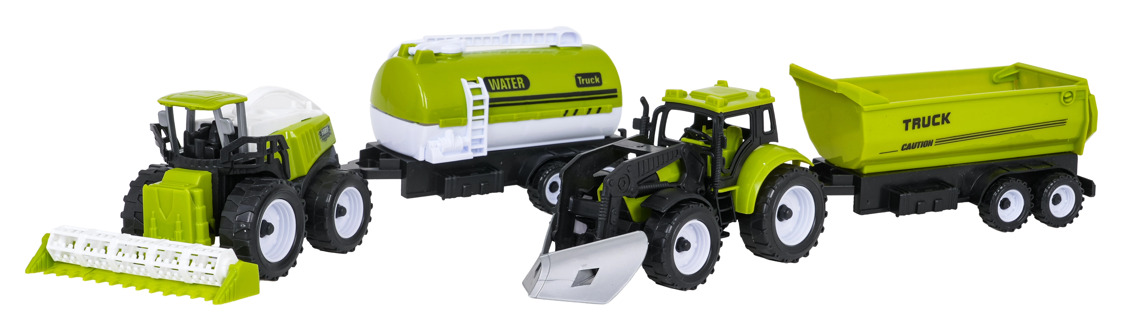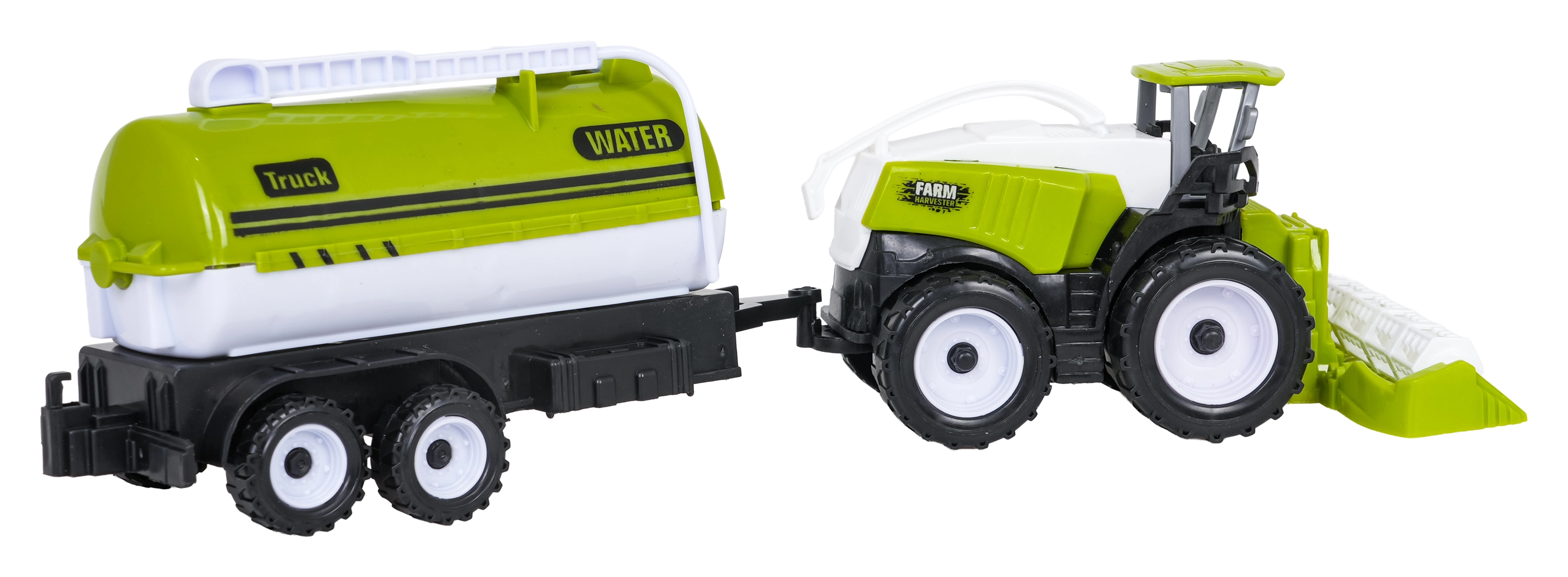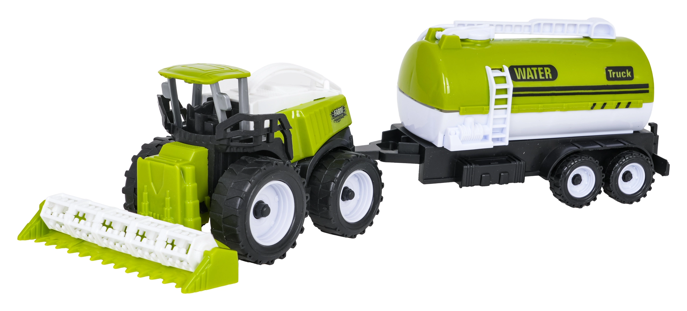 Tractor met ploeg, maaidorser, aanhanger en watertank. Alles is onderling te koppelen voor nog meer speelscenario’s.