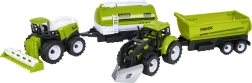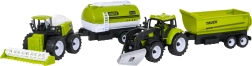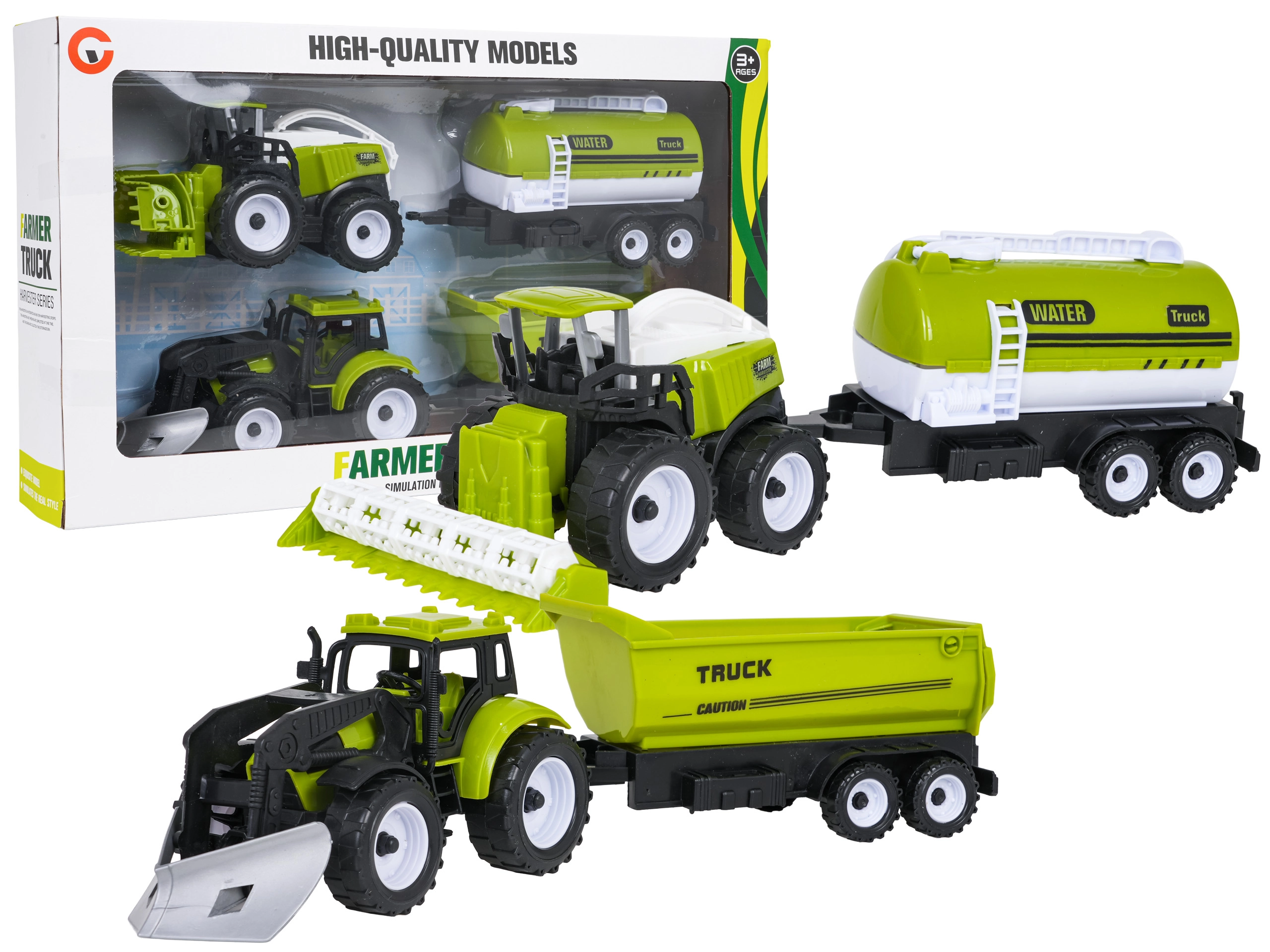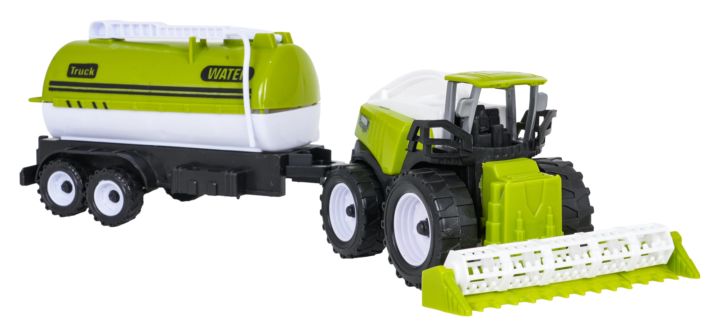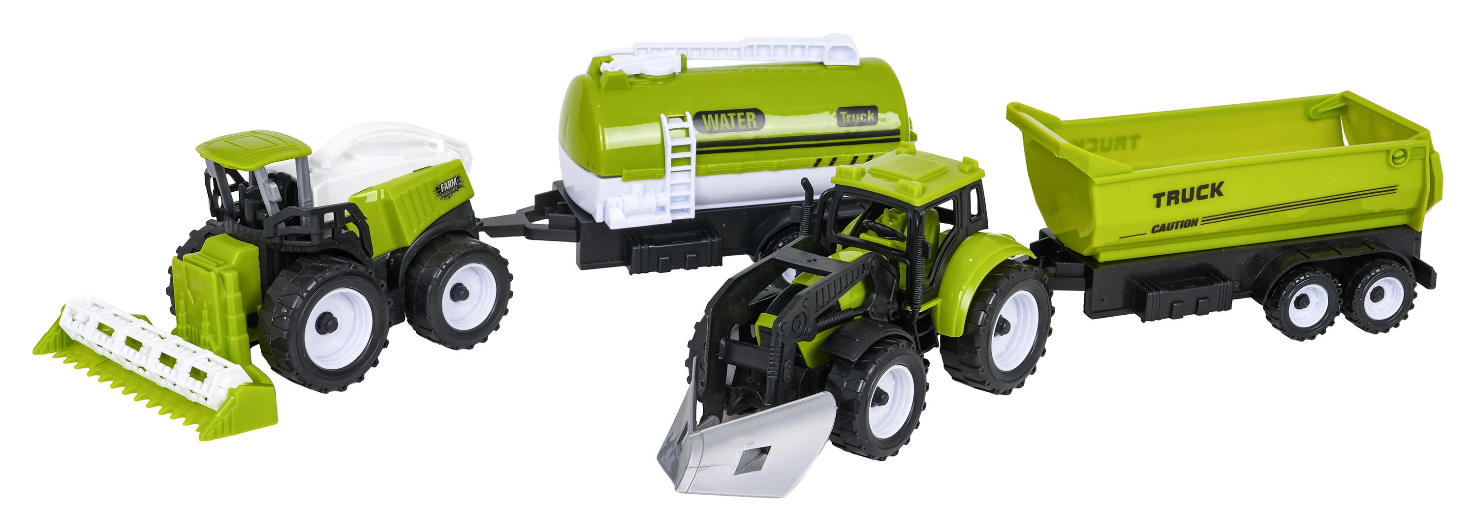 Tractor met ploeg, maaidorser, aanhanger en watertank. Alles is onderling te koppelen voor nog meer speelscenario’s.