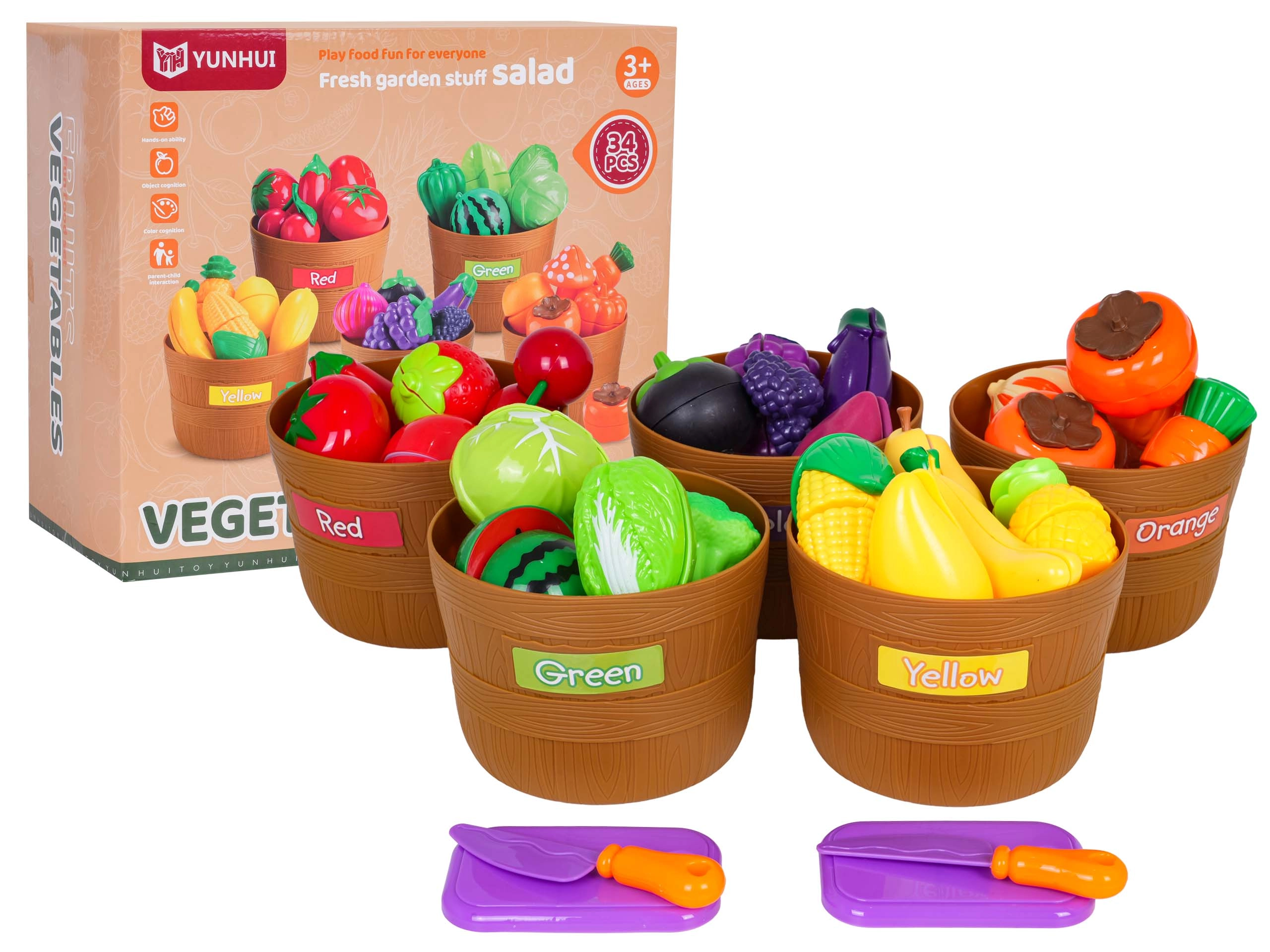 Vijf gemarkeerde mandjes (groen, rood, paars, oranje, geel) helpen kinderen fruit en groenten eenvoudig op kleur te sorteren en ontwikkelen logisch denken.