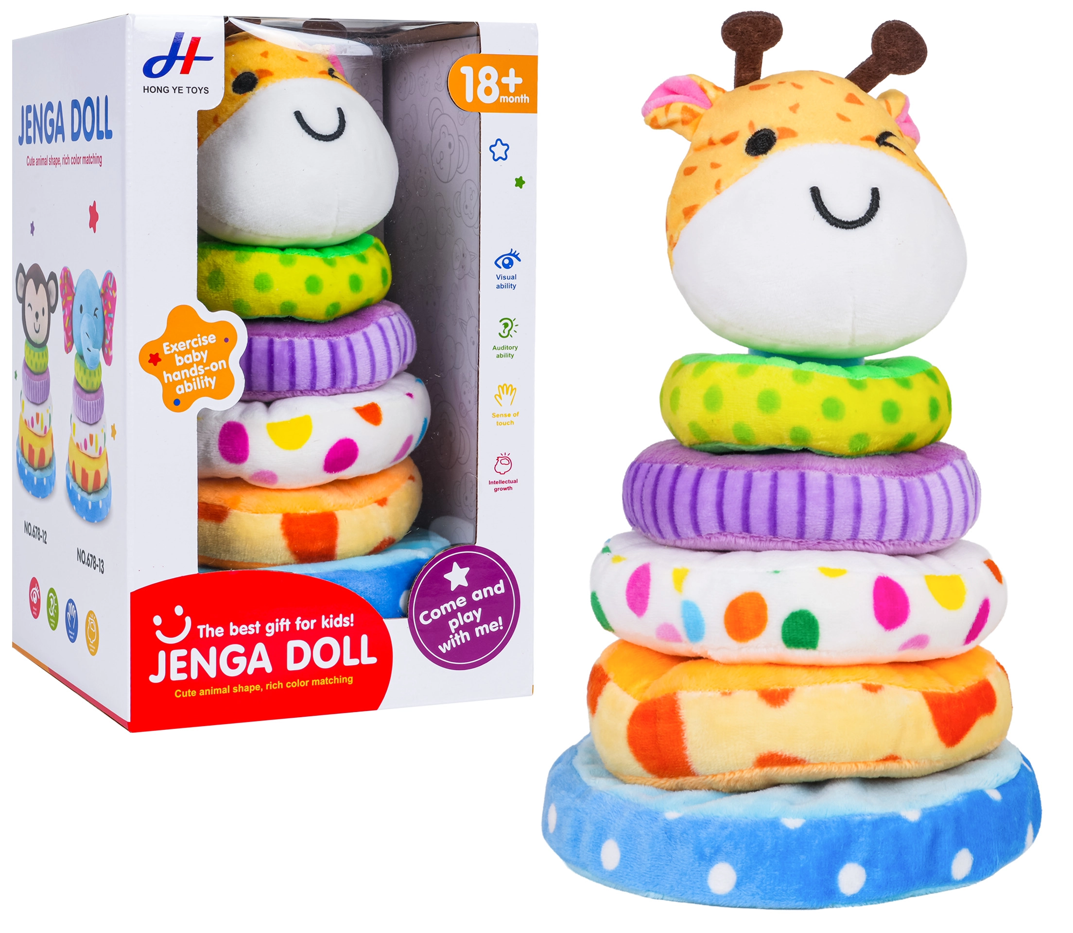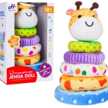 De zachte stapelpiramide giraf biedt kinderen een leuke en veilige manier om te leren. De set bestaat uit een stabiele basis, vier zachte ringen in verschillende groottes en het girafhoofd met pieper. Bonte patronen en aangenaam pluche ondersteunen de zintuiglijke ontwikkeling, terwijl het stapelen van de ringen logisch denken en geduld traint.