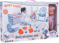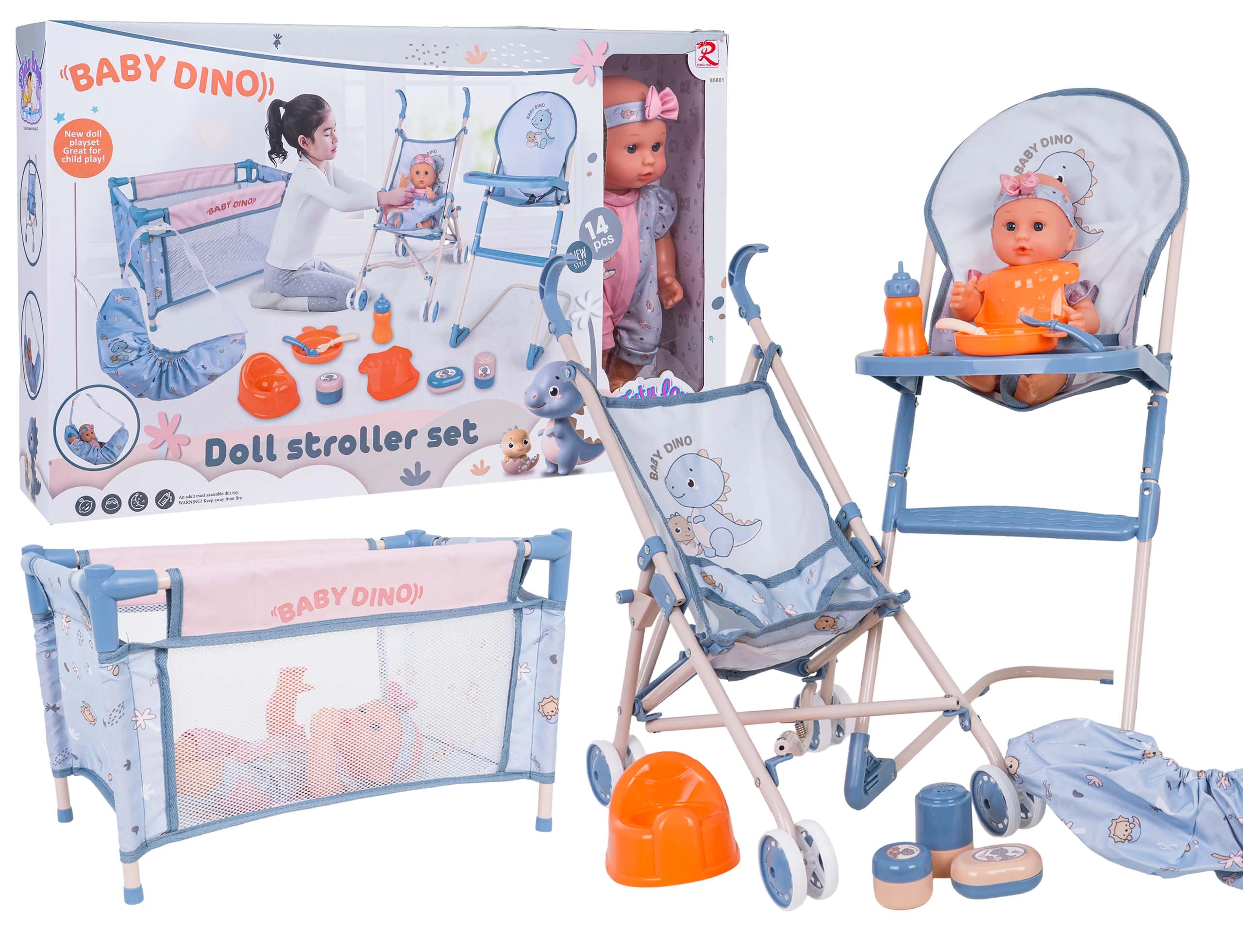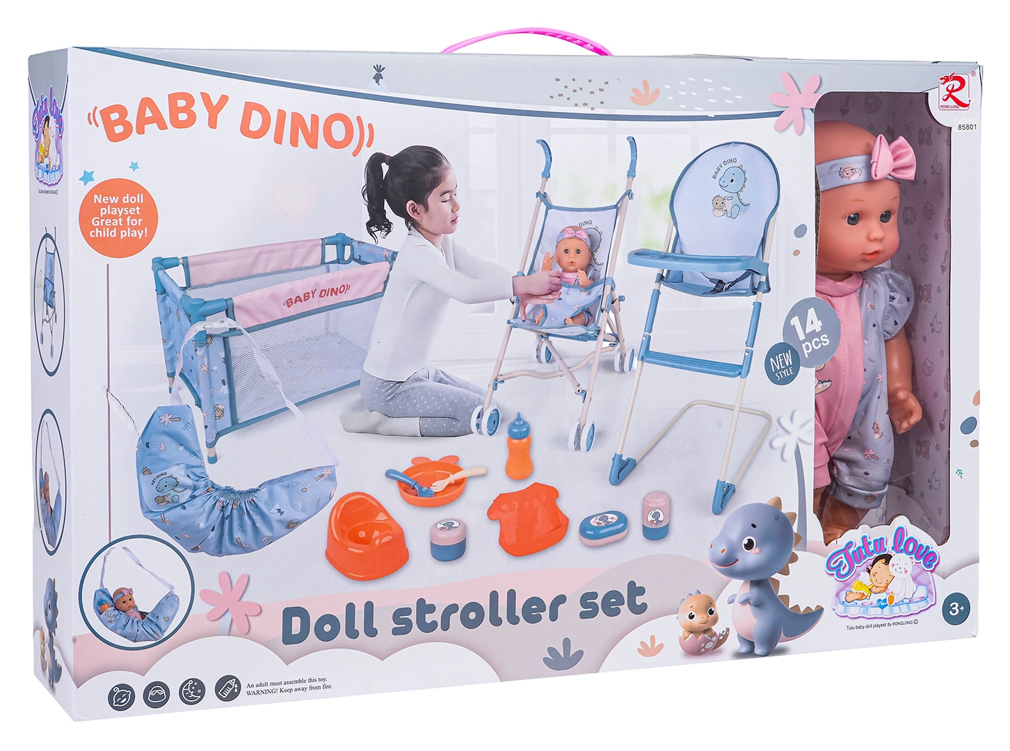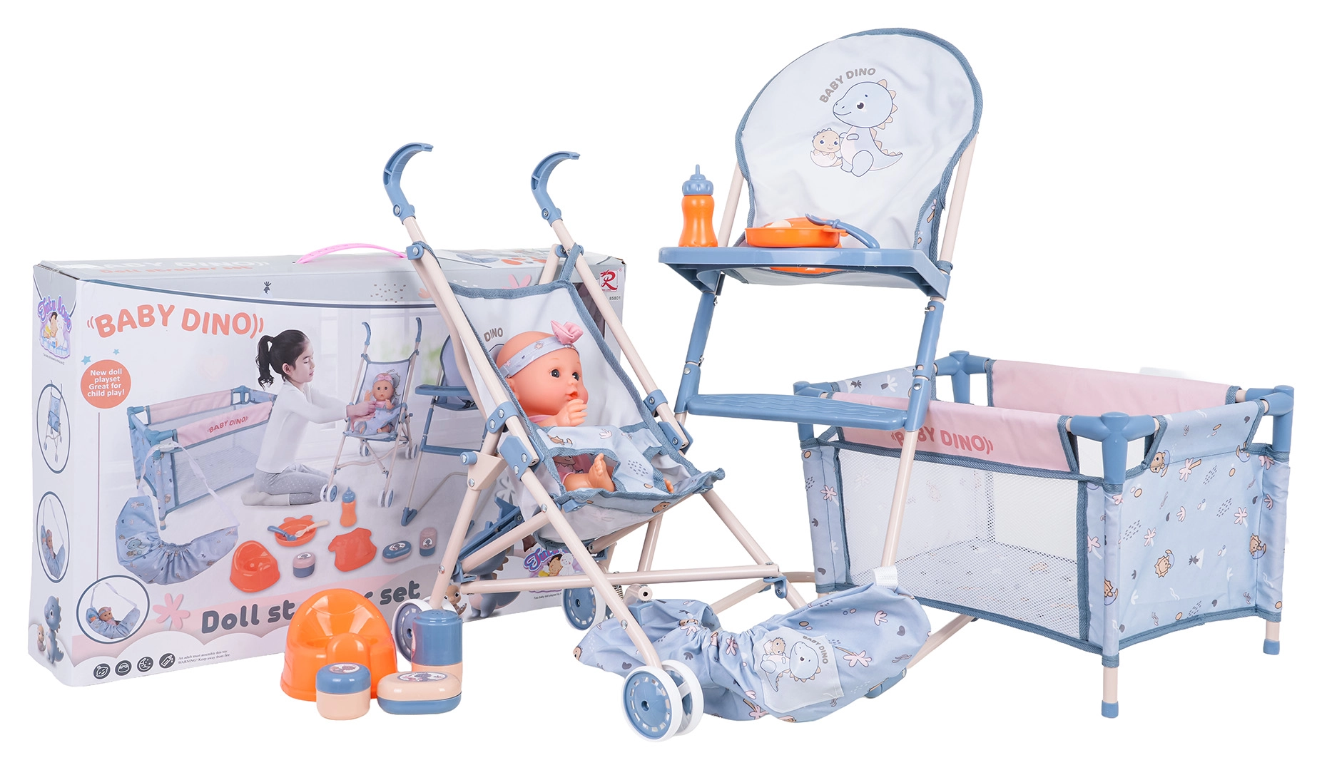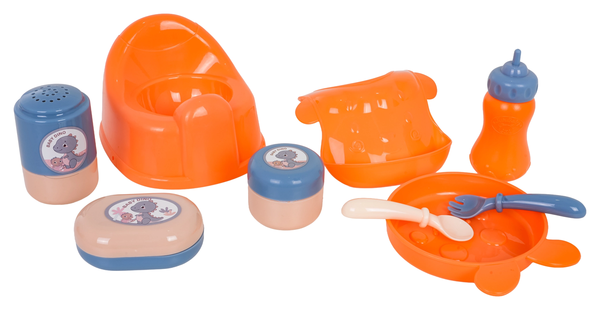 Ontdek een rijk uitgeruste speelset voor vadertje- en moedertje-spel met de schattige BABY DINO-pop en 14 stuks accessoires. De set bevat een buggy, kinderstoel, reisbedje, potje, fles en voedingsaccessoires. Dankzij de veilige materialen, levendige kleuren en de mogelijkheid om de pop te laten drinken en zindelijk te leren worden op het potje is de set ideaal voor kinderen vanaf 3 jaar.