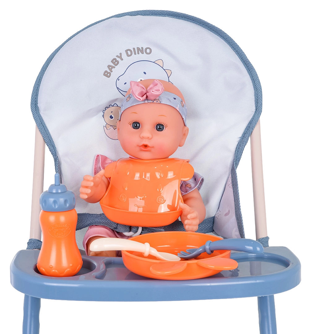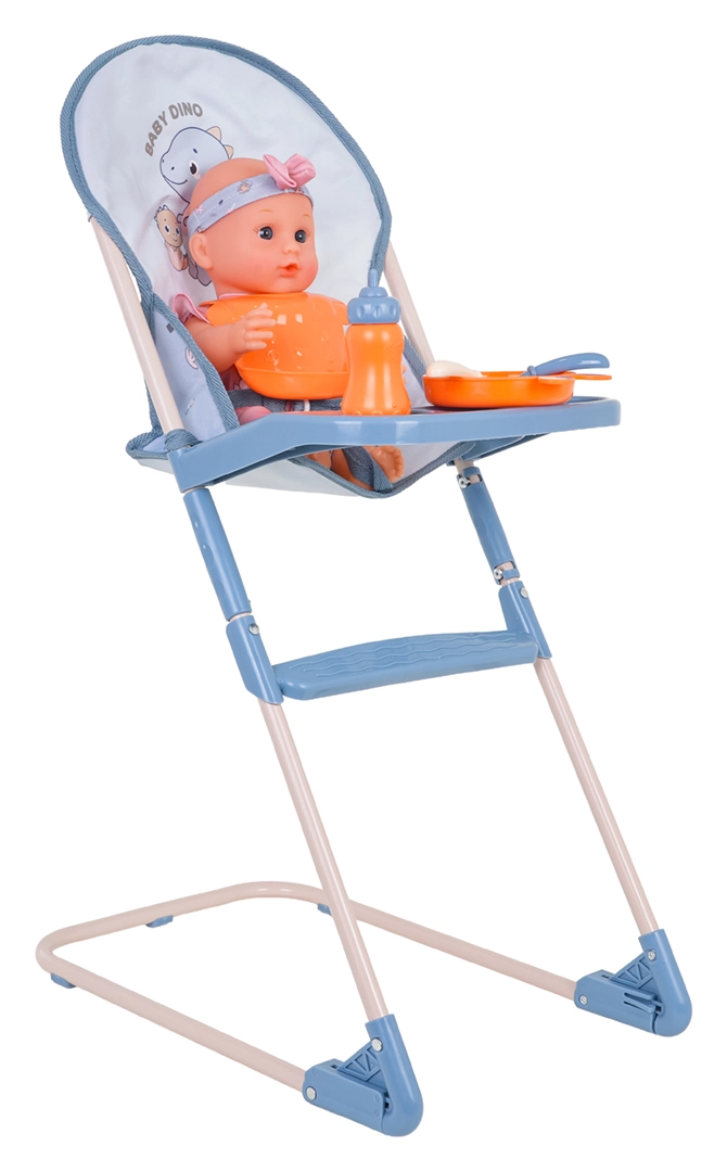 Comfortabel voeden van de pop dankzij de hoge kinderstoel met afneembaar blad en een set bestek, bordje, slab en flesje. Ideaal voor realistische zorgscenario’s.