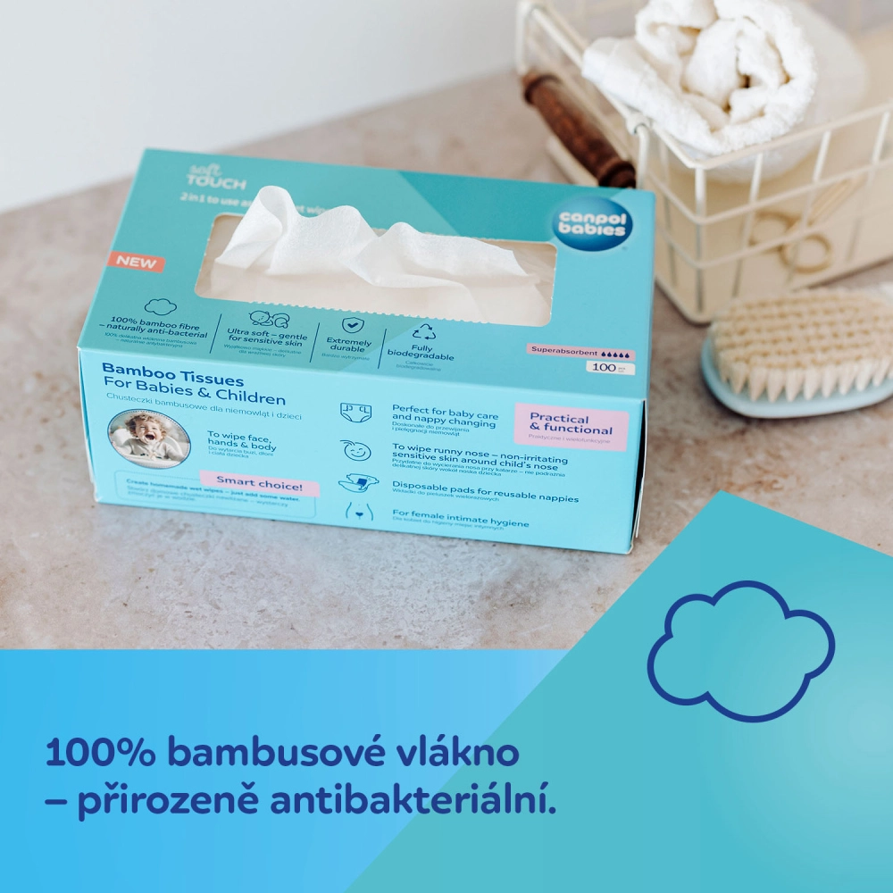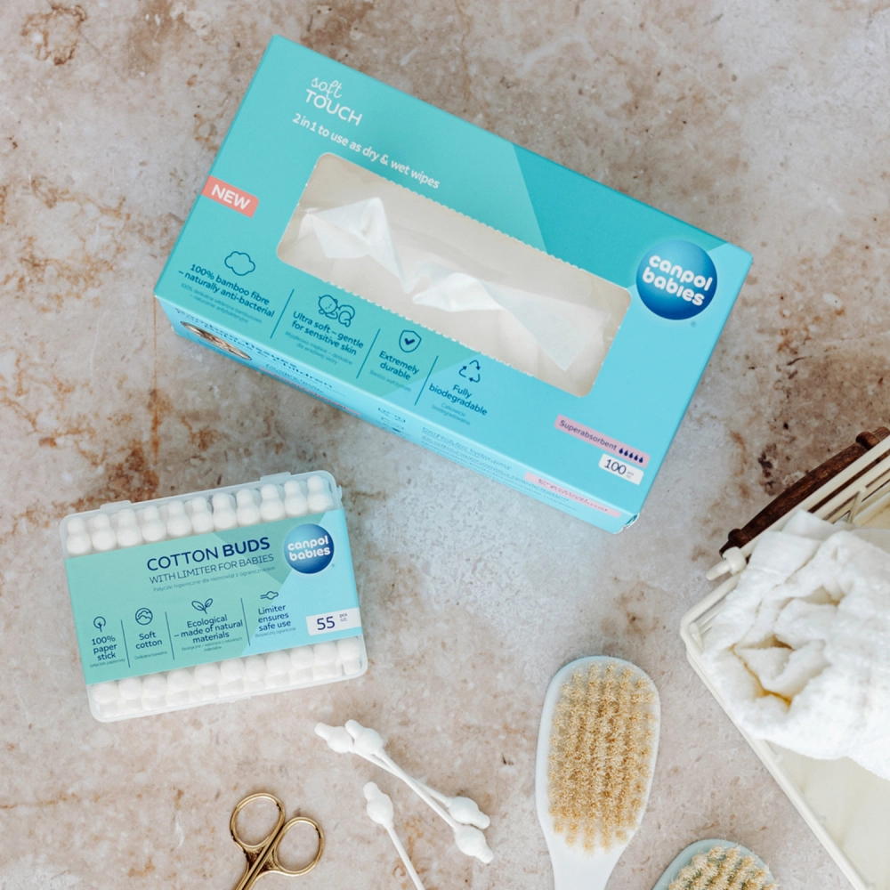CANPOL babies bamboe doekjes zijn ontworpen voor de gevoelige babyhuid – dermatologisch getest, zacht, sterk en chloorvrij gebleekt. Dankzij de natuurlijke bamboe non-woven stof nemen ze uitstekend vocht op en scheuren ze niet. Ideaal voor dagelijkse hygiëne, bij het verschonen, en om gezicht, handjes en neus zacht te reinigen zonder irritatie.