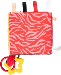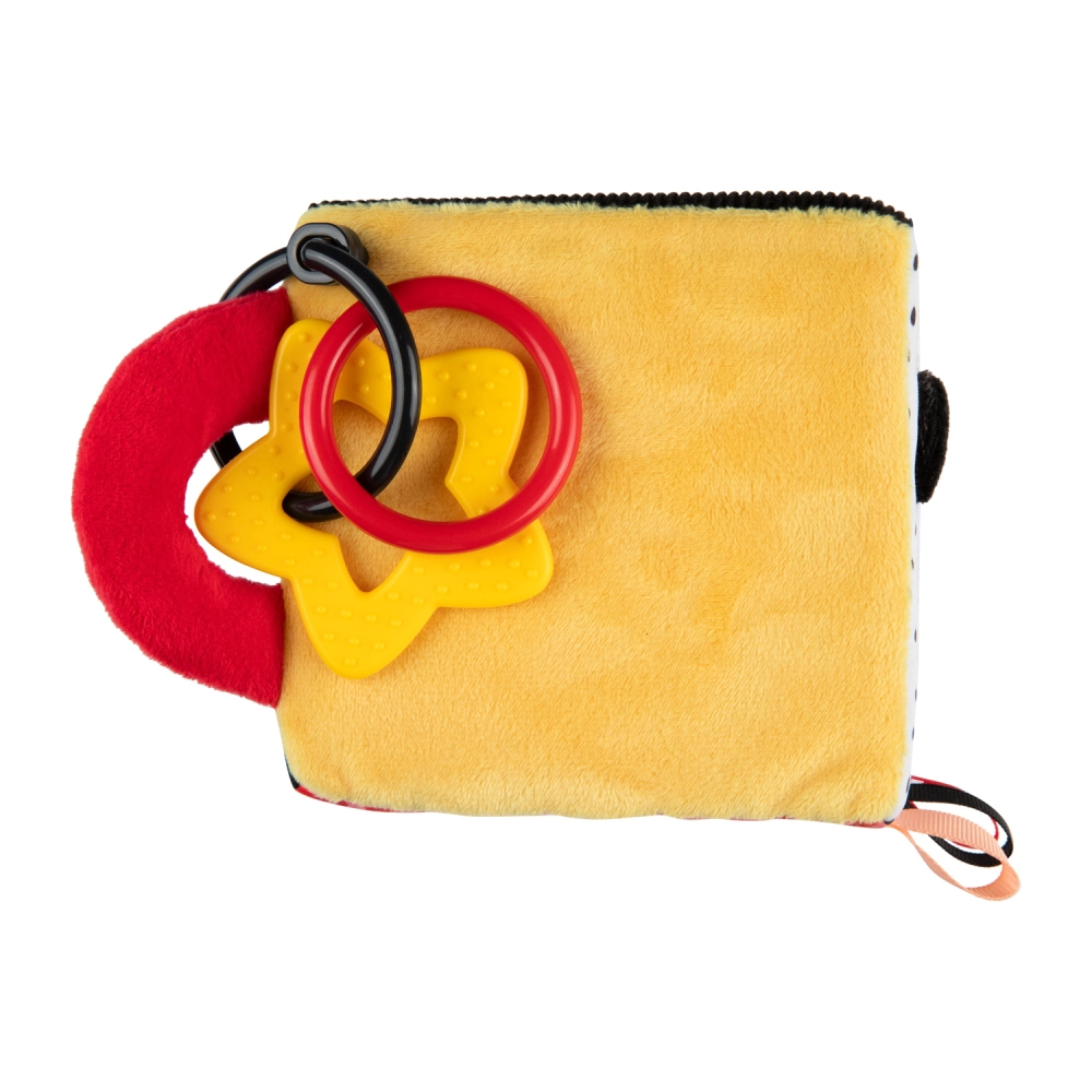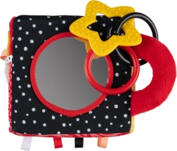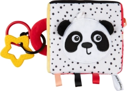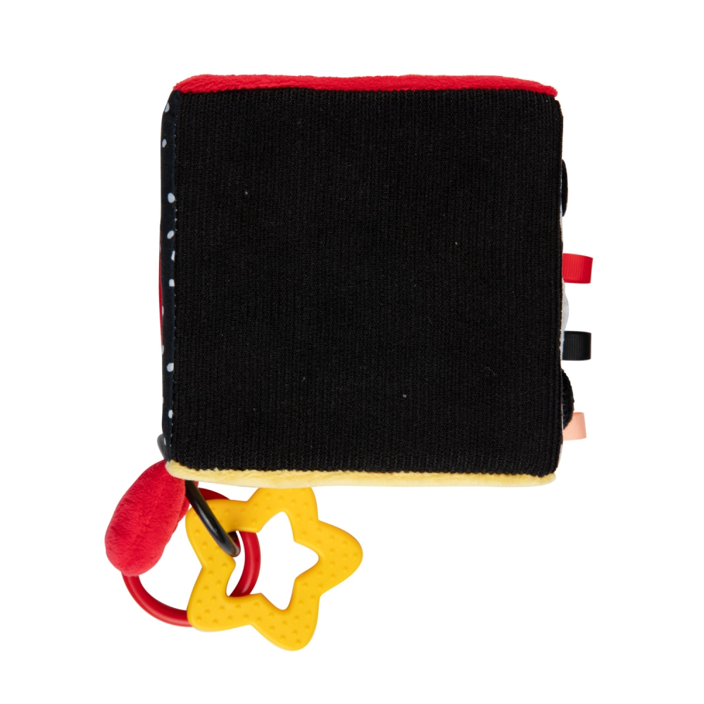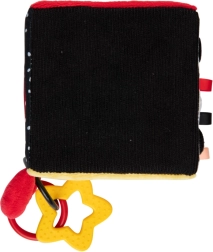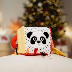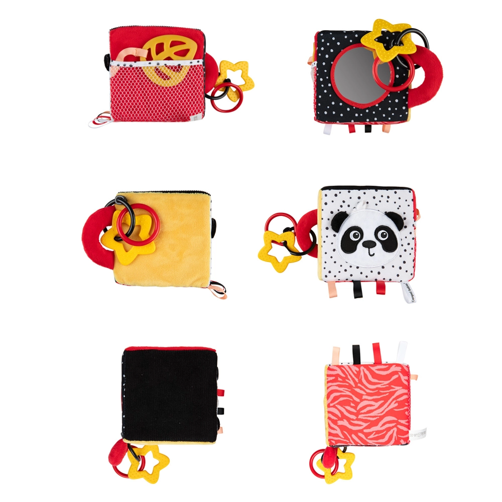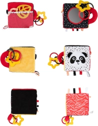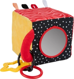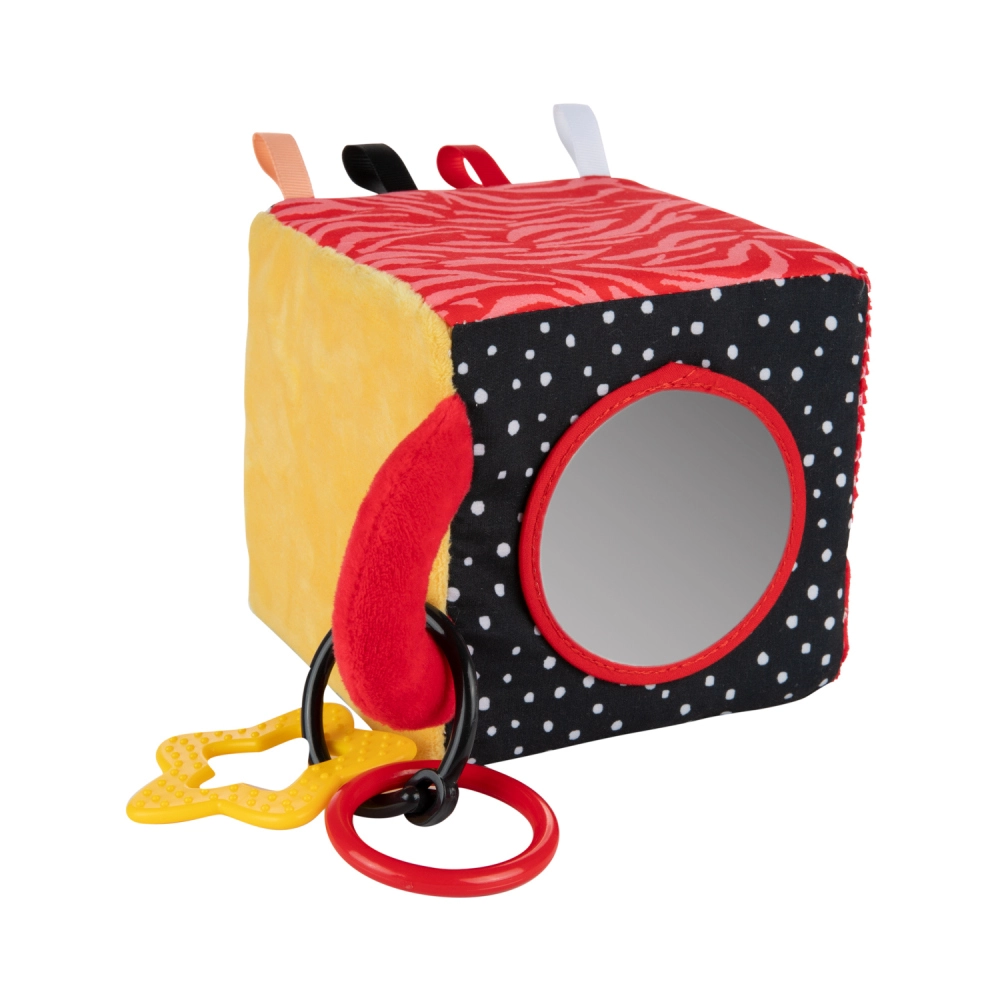 De sensorische kubus BabiesBoo is licht, zacht en ideaal voor kleine kinderhandjes. Contrasterende zwart-witte en kleurrijke patronen stimuleren het zicht; knisperende materialen en een zacht klingelende rammelaar ontwikkelen het gehoor; diverse texturen met lusjes prikkelen de tast. Het veilige spiegeltje ondersteunt zelfherkenning en hand-oogcoördinatie.