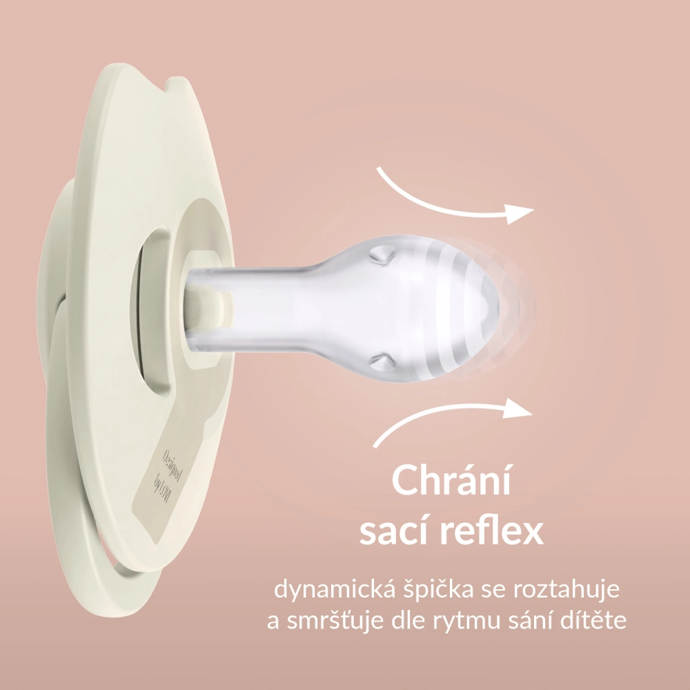 De siliconen speen met verschillende diktes zet tijdens het zuigen natuurlijk uit en krimpt weer. Zo zuigt het kind in zijn eigen tempo en ondersteunt de fopspeen zowel borstvoeding als natuurlijke gewoonten.