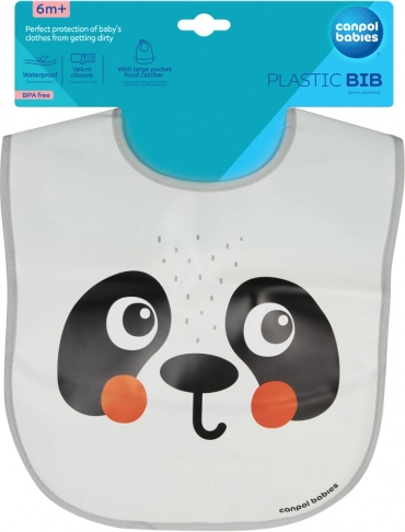 Praktische waterdichte slab met opvangzak van Canpol babies uit de BabiesBoo-collectie met pandamotief beschermt kleding tijdens het voeden en de eerste zelfstandige maaltijden. Dankzij de diepe opvangzak worden gevallen stukjes voedsel opgevangen, makkelijk schoon te maken door eenvoudig af te vegen of af te spoelen, en de comfortabele klittenbandsluiting zorgt voor snel om- en afdoen. Gemaakt van zacht BPA-vrij plastic, geschikt voor kinderen vanaf 6 maanden.