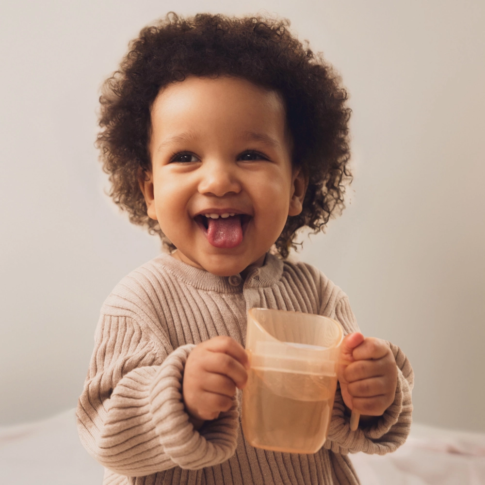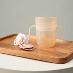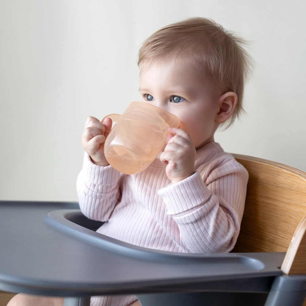 Het lichte ontwerp, de gevormde dubbele handgrepen en het kleinere startvolume (ca. 130 ml met inzet) vergemakkelijken de overgang van de fles. Zodra het kind er klaar voor is, verwijder je eenvoudig de inzet en krijg je een open beker met een inhoud van 150 ml – één product dat echt meegroeit met het kind.