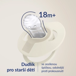 Het lichte, ergonomisch gevormde schild met ventilatieopeningen minimaliseert huidcontact en bevordert vrije luchtcirculatie, waardoor het risico op irritatie afneemt. Het lichtgevende element in de kern en de greep helpt de speen ook ’s nachts gemakkelijk terug te vinden. De afgeplatte tip en dunne hals maken een goede werking van tong en tandvlees mogelijk, wat het risico op malocclusie en spraakstoornissen verlaagt*.
