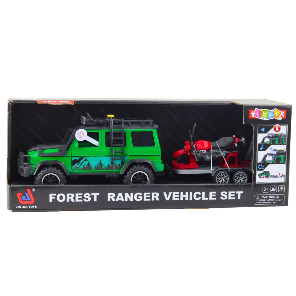 Leuke set voor kleine avonturiers: een terreinwagen met afkoppelbare aanhanger en motor zorgt voor realistisch spel, zowel binnen als buiten. Biedt licht- en geluidseffecten, openslaande deuren en een stevige constructie van hoogwaardig plastic. De groen‑zwarte offroad met berggraphics, robuuste wielen en een functionele oprijplaat op de aanhanger is ideaal voor creatieve speelscenario’s en het ontwikkelen van de fijne motoriek.