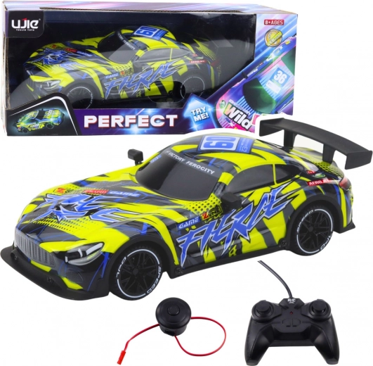 Stijlvol RC-raceauto in geel‑blauw‑zwart design met volledig rijfunctiebereik, stabiele besturing op 27 MHz en een effectvol verlichte carrosserie die met een aparte knop wordt bediend. De robuuste constructie en de mogelijkheid tot spoorinstelling (toe‑in) van de wielen zorgen voor veel plezier en betere controle over de rit.