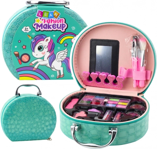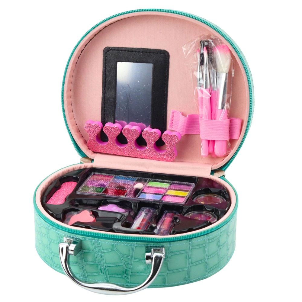Deze mooie kinderset met cosmetica stimuleert fantasie en fijne motoriek. Alles is overzichtelijk geordend in een afsluitbaar rond tasje met handvat, waardoor het makkelijk te dragen en netjes te houden is. Perfect voor thuisplezier, verjaardagsfeestjes en speelafspraakjes.